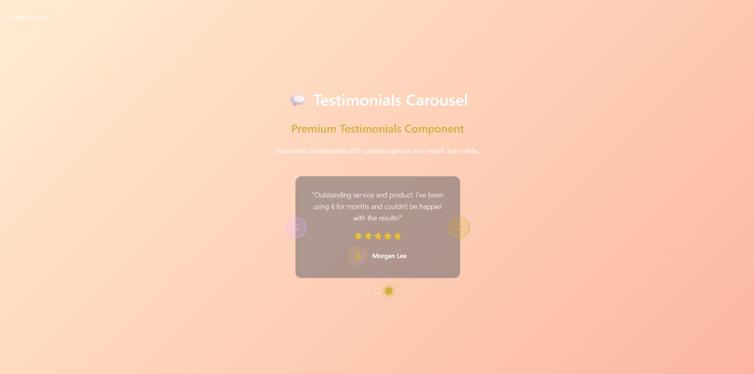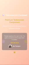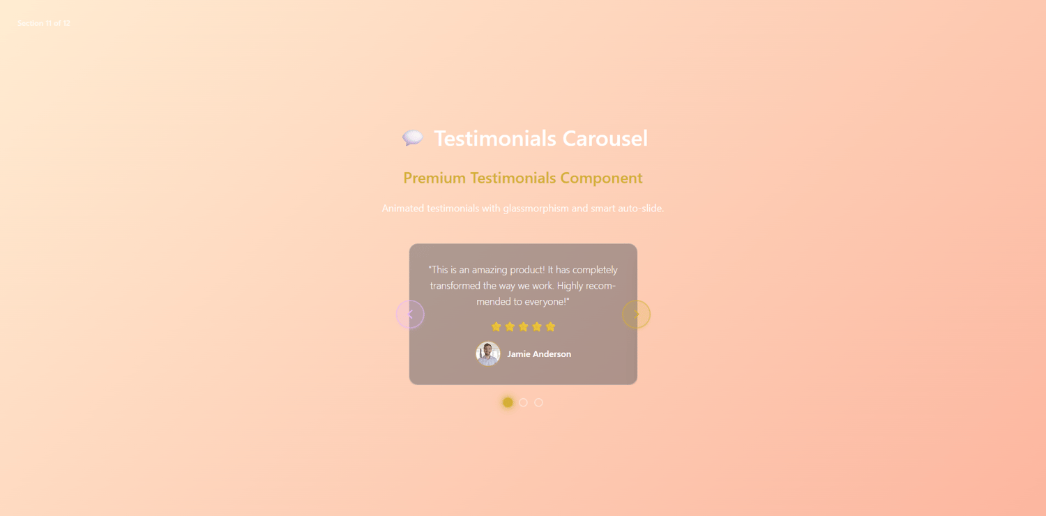 Beautiful React testimonials showcase with star ratings, avatars, auto-slide, and glassmorphism design. Accessibility compliant, mobile optimized, easy customization.