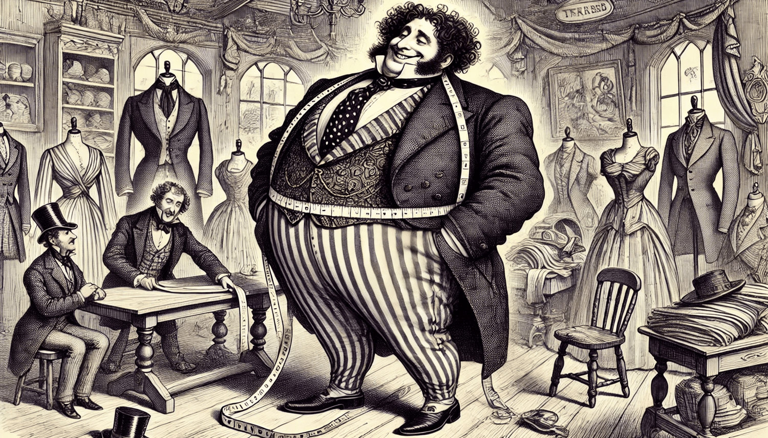 A highly detailed and humorous Victorian-inspired illustration, capturing the essence of Charles Dickens' world. This artwork brings to life the eccentric tailor Mr. Trabb in a satirical, vintage engraving style—perfect for literature lovers and fans of historical aesthetics.