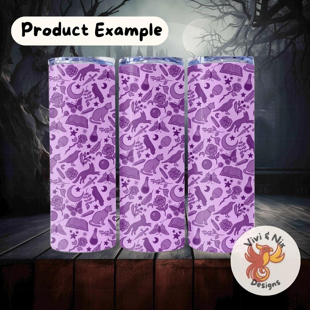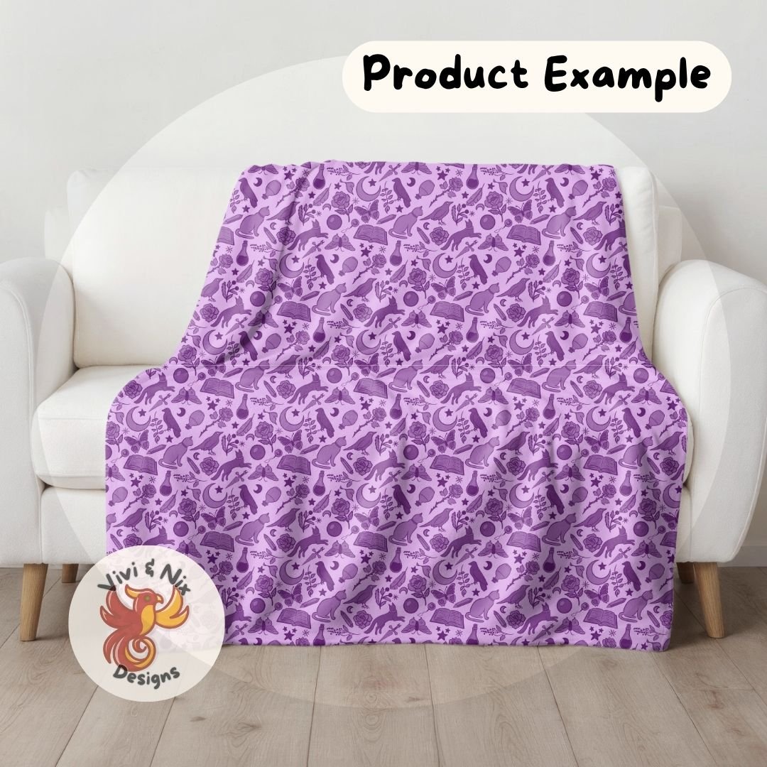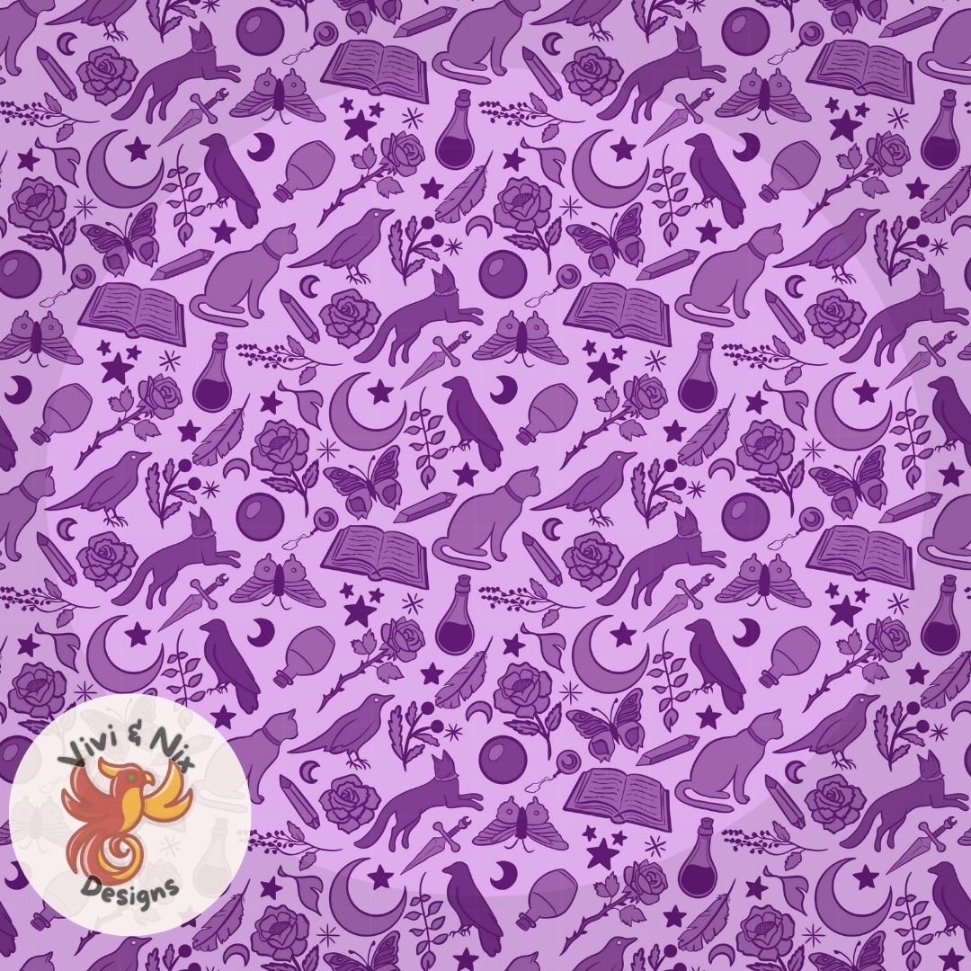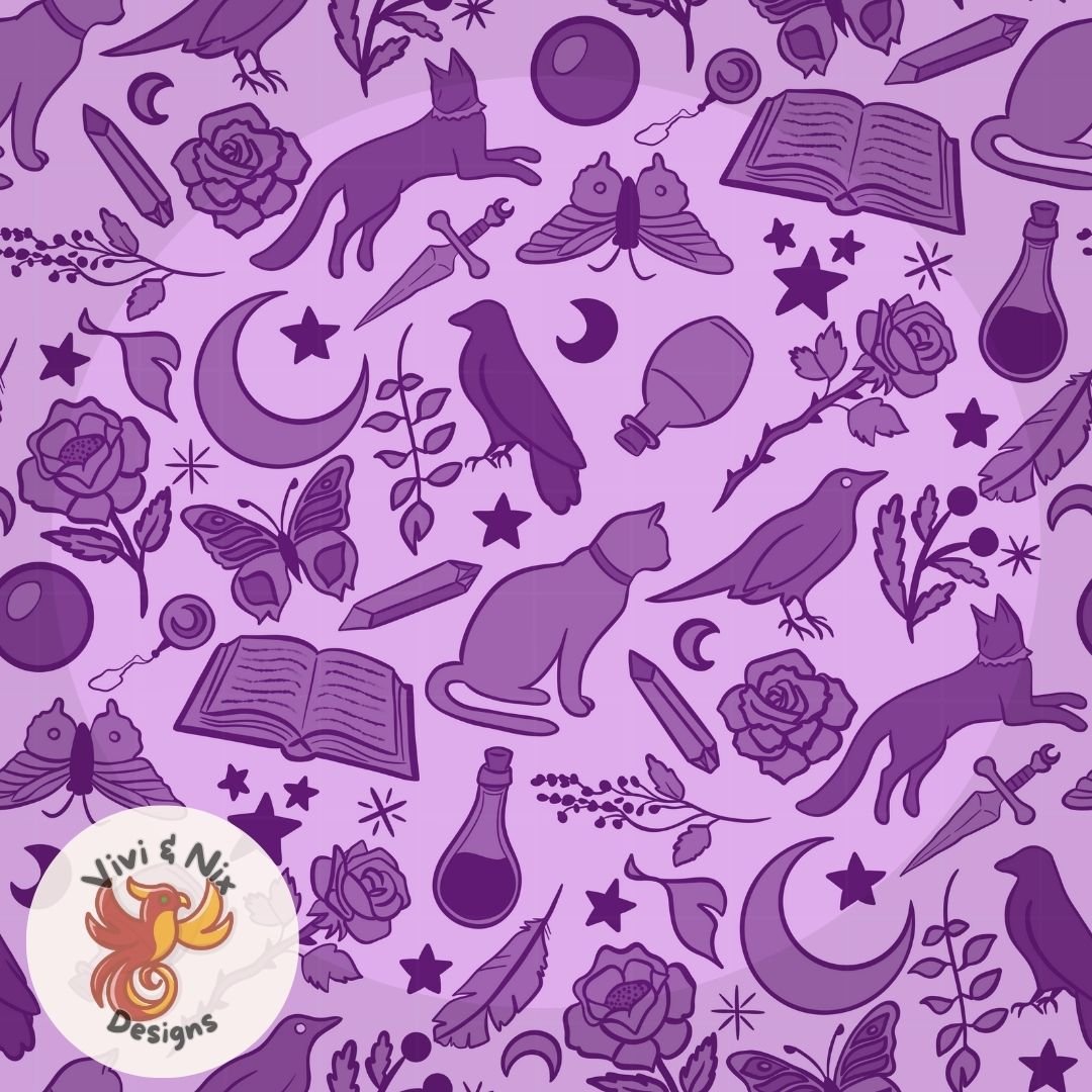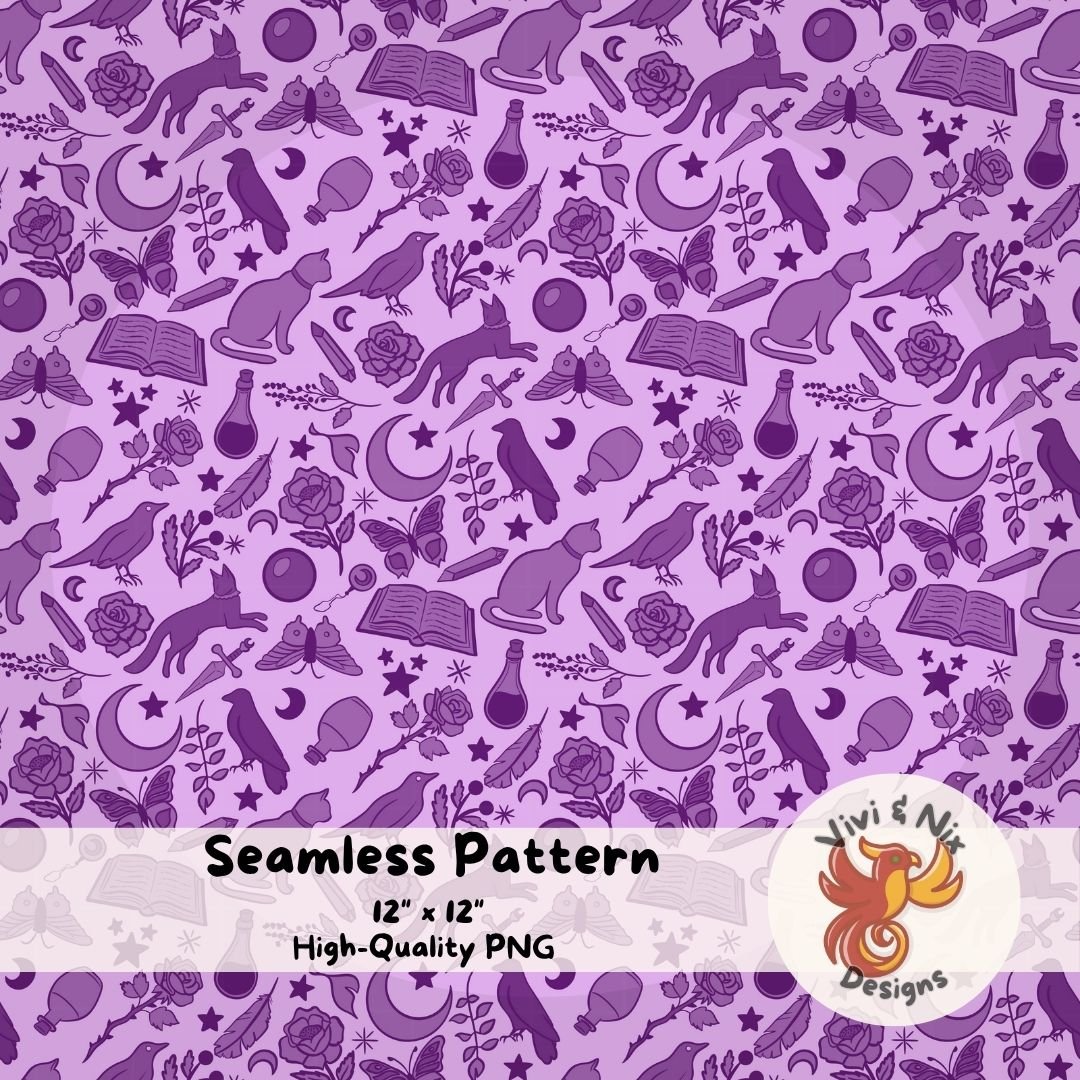 Bring magical energy to your creations with this purple witchy seamless pattern, featuring hand-drawn cats, crows, moths, roses, moons, stars, potions, spellbooks, and more. Perfect for witchcore, Halloween, whimsigothic, magical girl aesthetics, and mystical crafting projects.