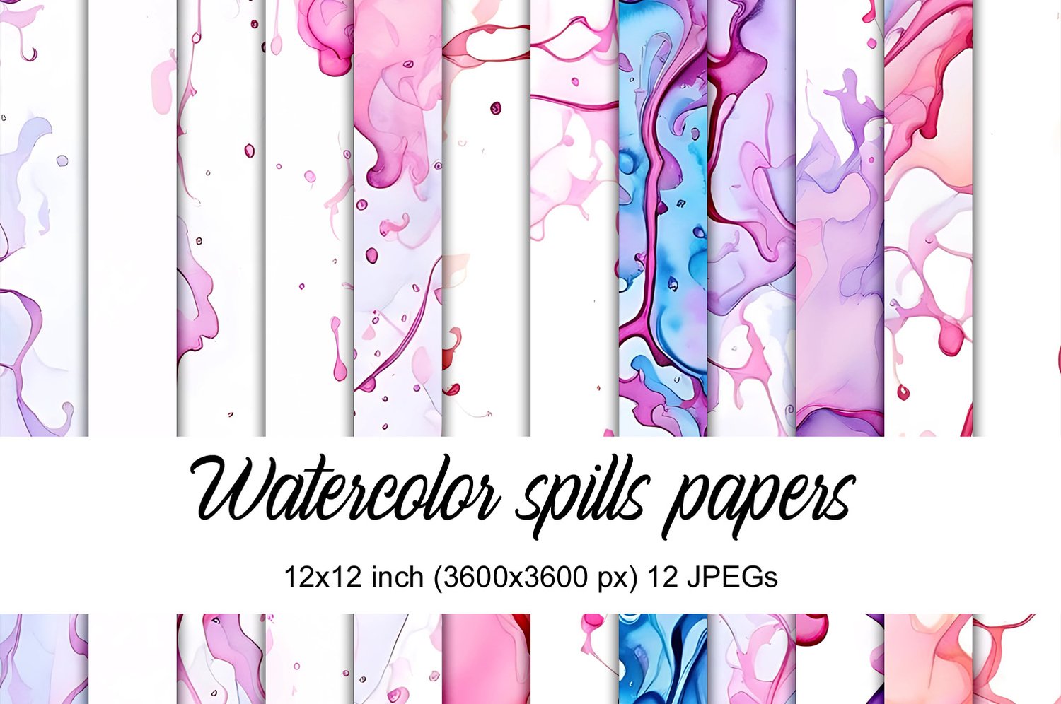 Watercolor spills is collection of 12 digital images, in size of digital paper – 3600 x 3600 pixels (or 12×12 inches).