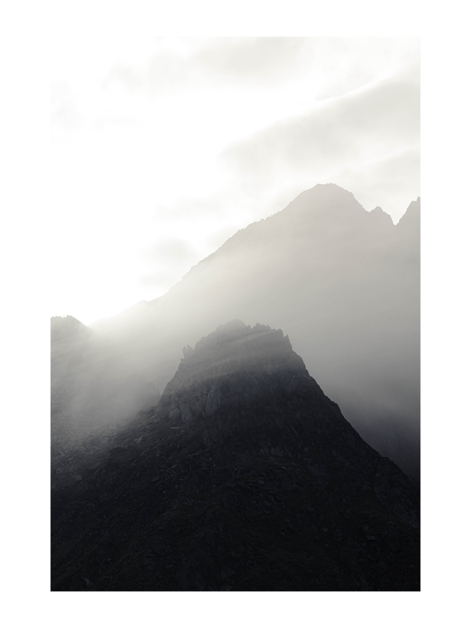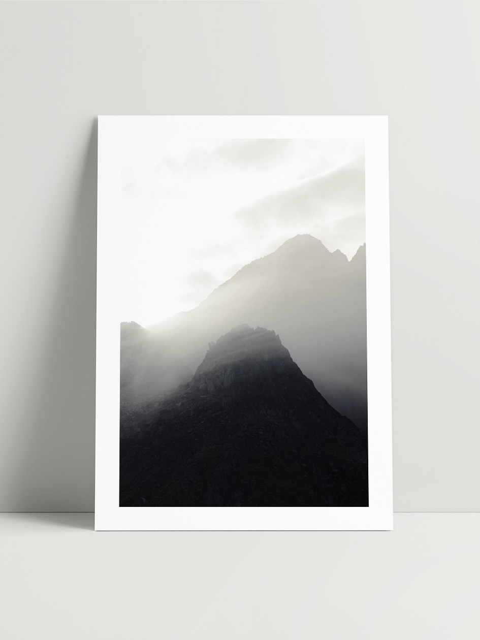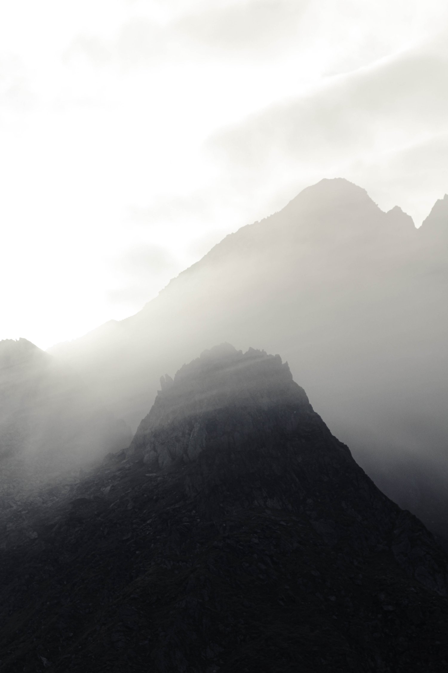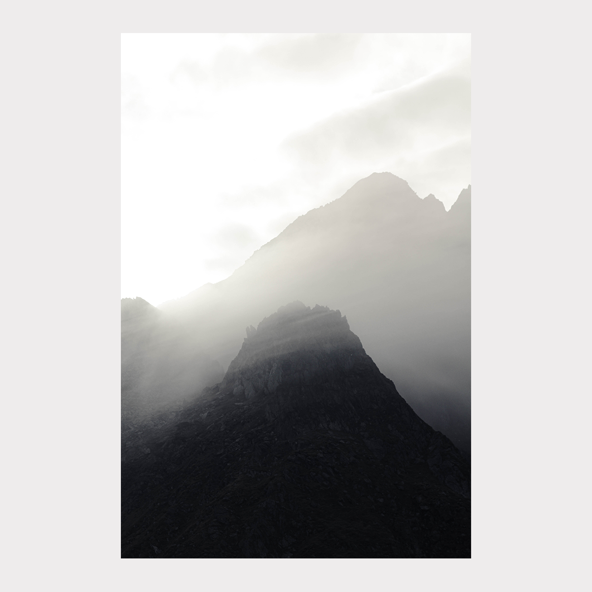 Je marchais sur une crête entièrement noyée dans les nuages, incapable de voir à plus de quelques mètres. Et puis, d’un coup, le vent a balayé le brouillard et le paysage s’est ouvert : un pic acéré dans les nuages, noir et contrasté, puis derrière lui une montagne massive dont on devinait à peine la silhouette.