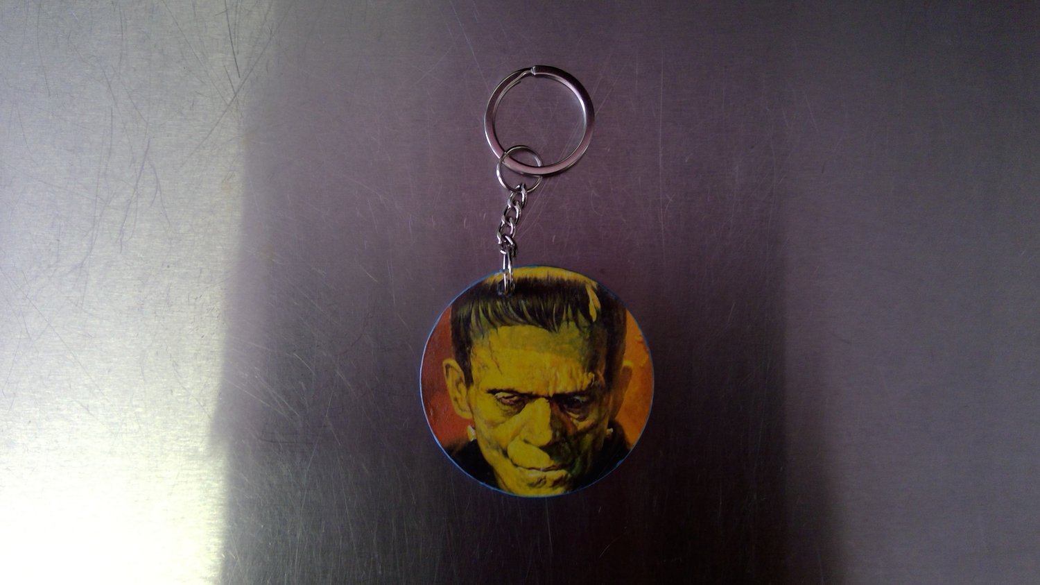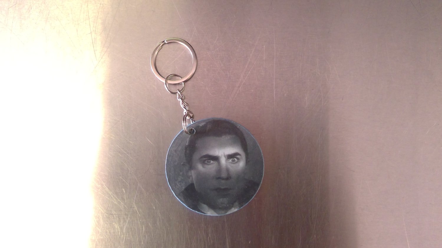 This is two different images Mod Podged and coated, on a 2.5" piece of acrylic. Even though Bela Lugosi hated Boris Karloff, you can enjoy them both together through the power of a keychain.