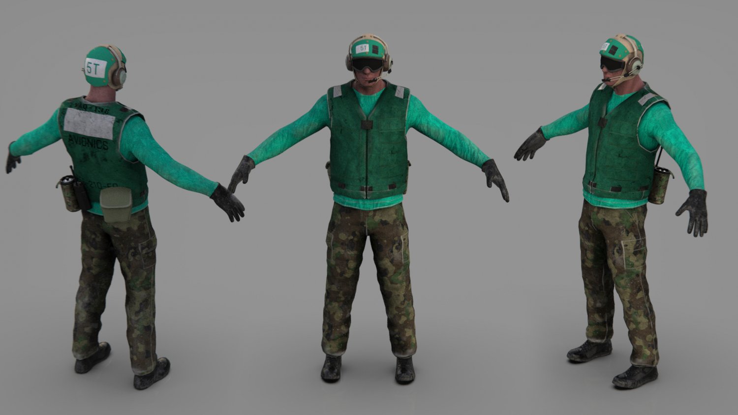 Bring realism and authenticity to your naval or military scenes with this detailed 3D model of a U.S. Navy Flight Deck Crew member in the iconic green shirt uniform.