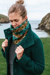 This cowl is inspired by allover Fair Isle Jumpers of the 70s and 80’s, the motif features big and small stars in a shaded retro colour palette. Its knit as a tube using two needle sizes – larger on the outside and then smaller, this means the inside sits nicely and a gentle funnel shape is created.