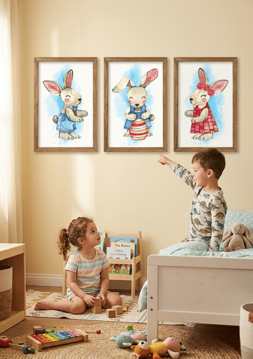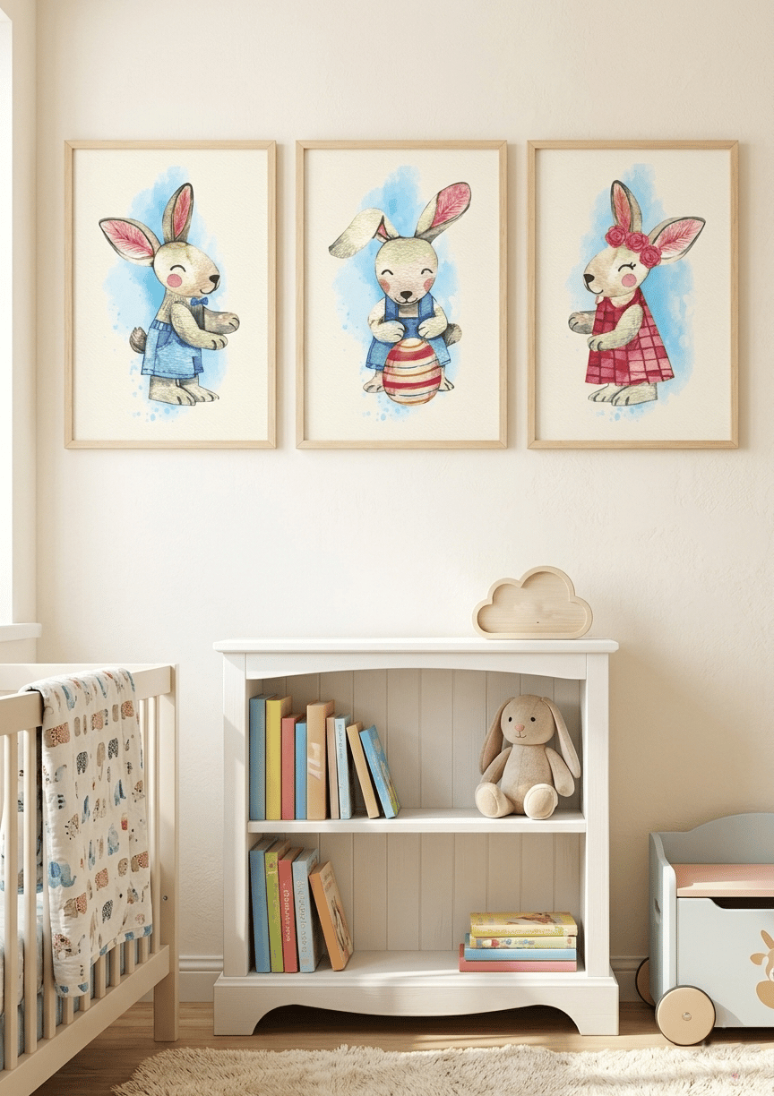 - Add a touch of whimsy and warmth to your little one's nursery with this charming set of three watercolor rabbit illustrations. Each bunny features a unique, adorable look: one in blue overalls, one holding a festive Easter egg, and one wearing a beautiful flower crown.