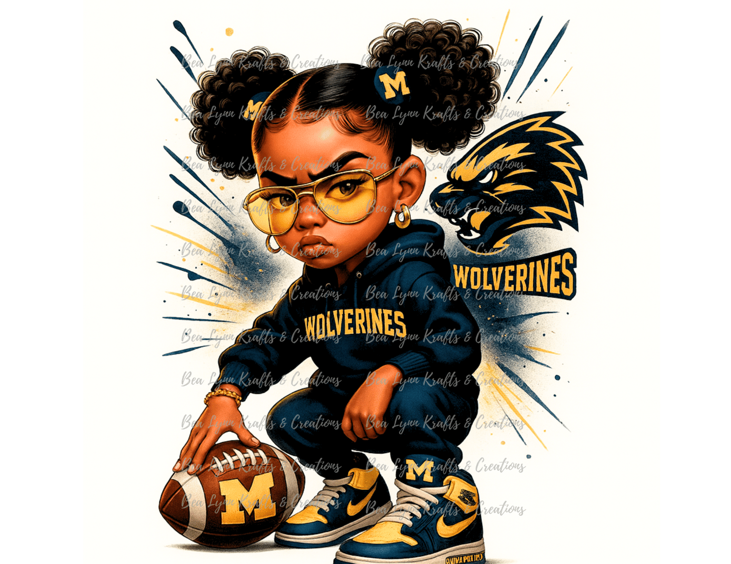 This Michigan Wolverines Girl PNG features a fierce, attitude-filled 3D-style cartoon girl dressed head-to-toe in Wolverines gear. She rocks a navy hoodie with bold “WOLVERINES” lettering, matching joggers, and blue-and-maize sneakers. Her oversized yellow sunglasses, gold hoops, and confident kneeling pose give her a powerful game-day aura. Curly puff buns with “M” logo bows complete the look, making this design irresistible for Michigan fans.