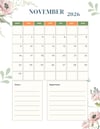 This document is a planner for the year 2026. It features a floral design with pink and yellow flowers and includes various sections for organizing daily, weekly, and yearly schedules. The planner contains detailed monthly calendars, as well as specific pages for daily and weekly planning with sections for notes, priorities, and to-do lists.