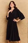 This dress is meticulously designed to enhance your figure, featuring a surplice neckline that beautifully accentuates your décolletage and a fitted waist that highlights your natural curves. TThis dress is meticulously designed to enhance your figure, featuring a surplice neckline that beautifully accentuates your décolletage and a fitted waist that highlights your natural curves. The midi length hem adds a touch of timeless elegance, falling gracefully below the knees. It strikes the perfect balance between chic and modest, making it suitable for various occasions and versatile enough for both formal and casual settings.One of the best features of this dress is its versatility. With its classic design, you can effortlessly dress it up or down depending on the occasion. Pair it with heels and statement accessories for a sophisticated evening look, or opt for sandals and a denim jacket for a more relaxed and casual ensemble.Pattern type: SolidStyle: ClassyFeatures: Basic styleNeckline: SurpliceLength: MidiSleeve length: Three-quarter sleevesSleeve type: Dolman sleevesHem shaped: A-lineSheer: NoBody: Not linedMaterial composition: 95% polyester, 5% spandexStretch: Moderate stretchCare instructions: Machine wash cold. Tumble dry low.Made in VietnamModel information:Anastasia-height 5'9", bust 34", waist 25", hip 35", size S, jeans size 3Product measurements:S: bust 32 in, length 45 inM: bust 34 in, length 46 inL: bust 36 in, length 47 in