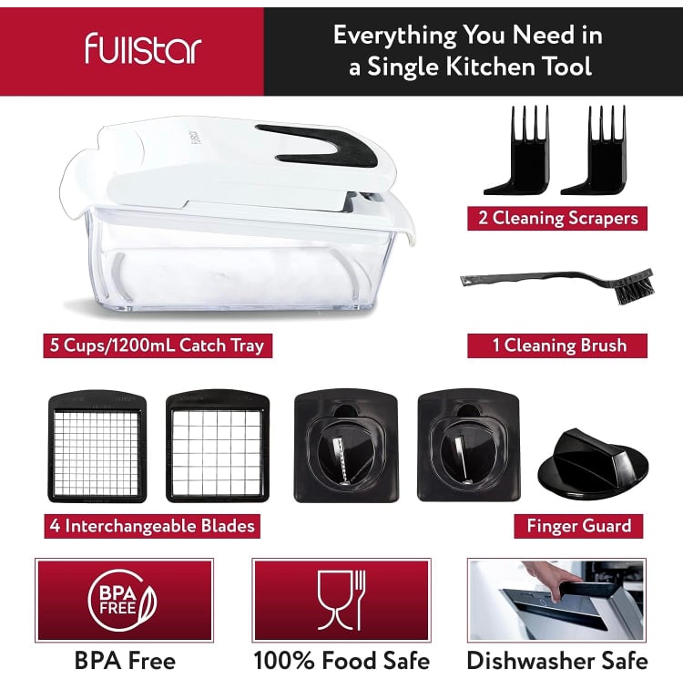 4 interchangeable blades let you julienne, chop and slice vegetables with ease. Built-in chop lid lets you cut foods directly into the 1.2L collection tray without the mess of a knife and cutting board. Storage container lets you hold prepared vegetables in the Fullstar Vegetable Cutter until you are ready to begin cooking. This 7-piece set is destined to become the favorite among all your home kitchen tools.