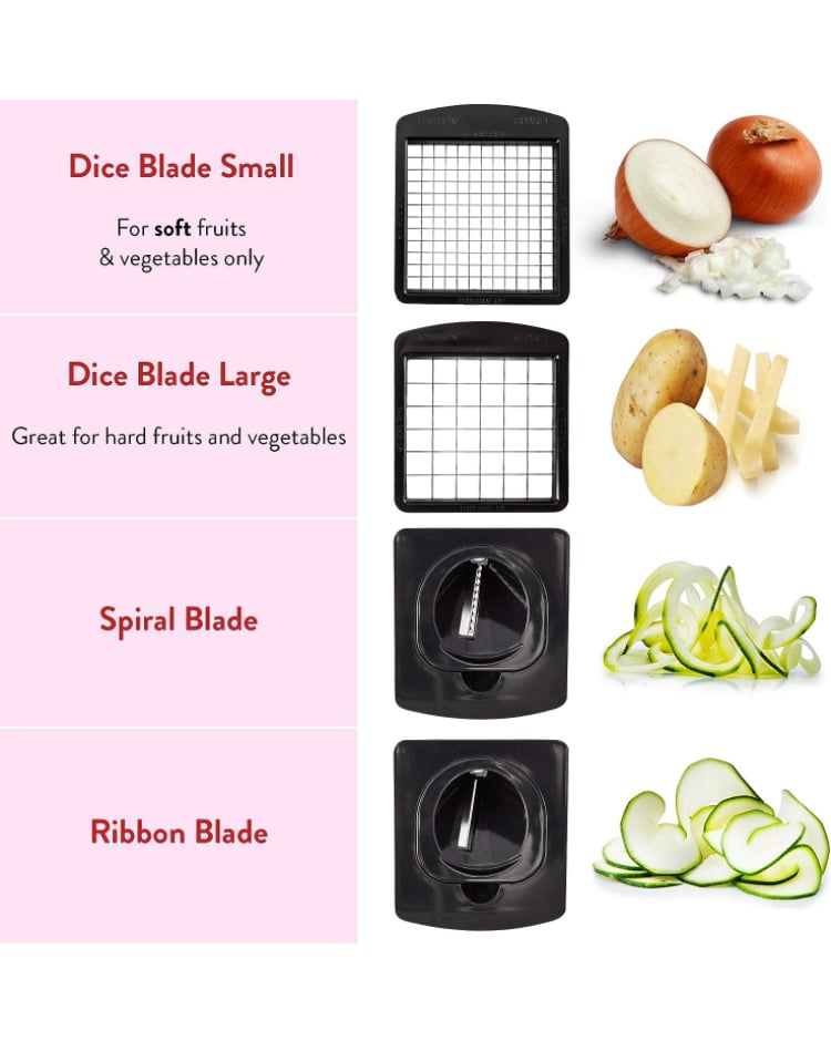 Soft grip handle with rubberized tpu enhances leverage while the non-skid base ensures stability during use. Slice, dice, chop and cut fruits and vegetables safely and easily, in half the time.