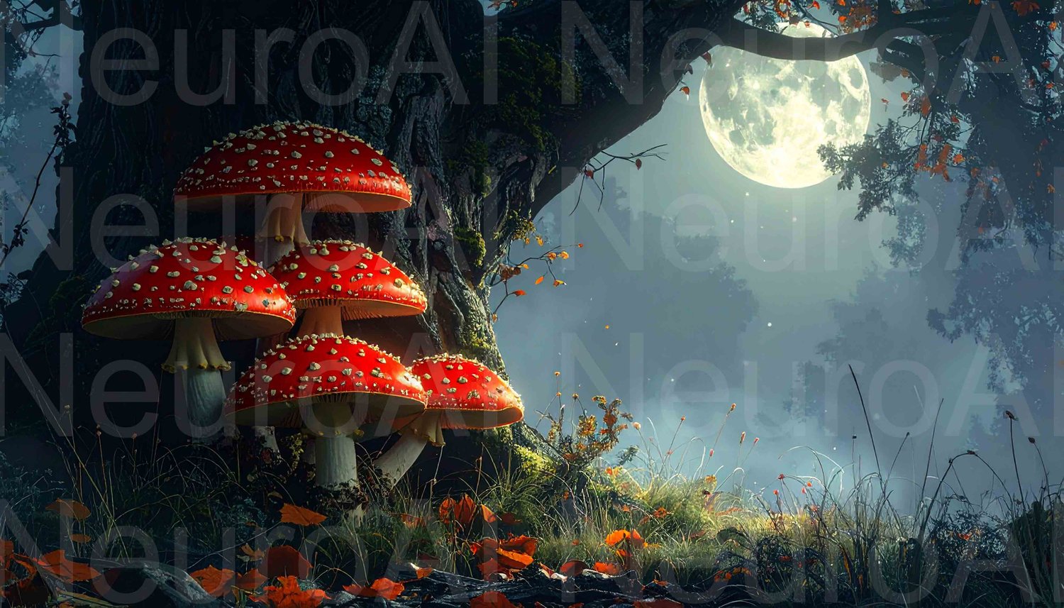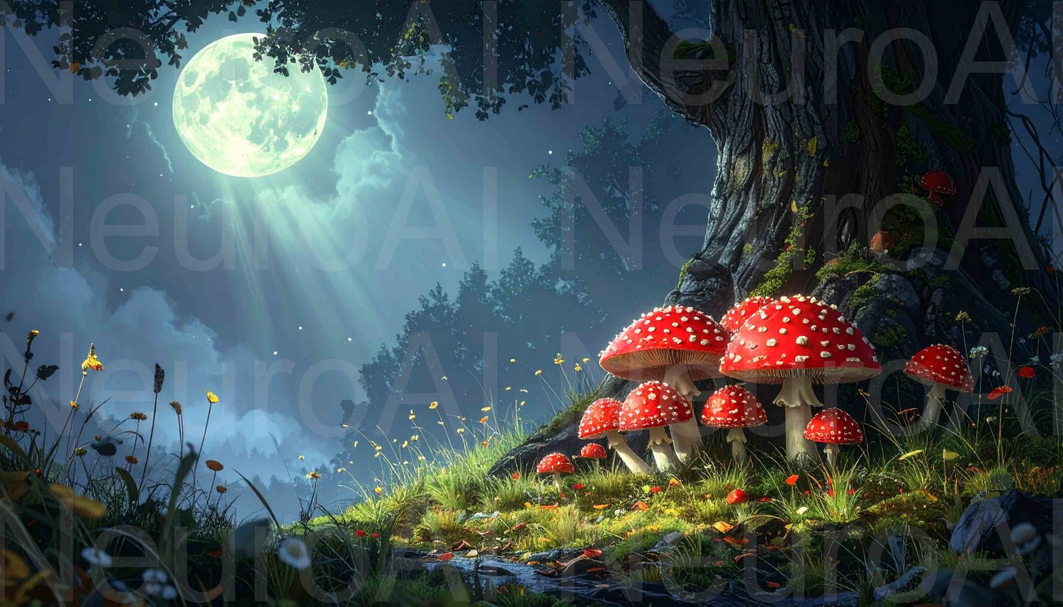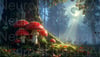 Enchanted mushroom circle under moonlight glows