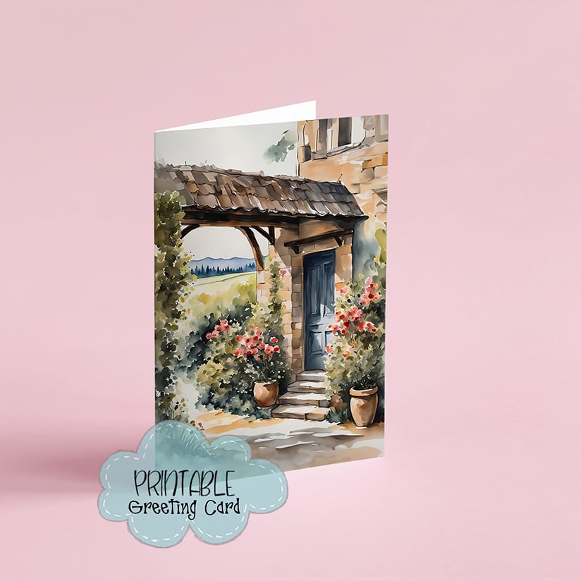 Delight your loved ones with this charming printable greeting card featuring a picturesque cottage adorned with a lovely blue door, a whimsical archway blooming with vibrant flowers, and potted plants boasting red blooms on the stone porch steps. Perfect for any occasion, this shabby chic design exudes warmth and nostalgia, making it a wonderful choice for sending heartfelt wishes.