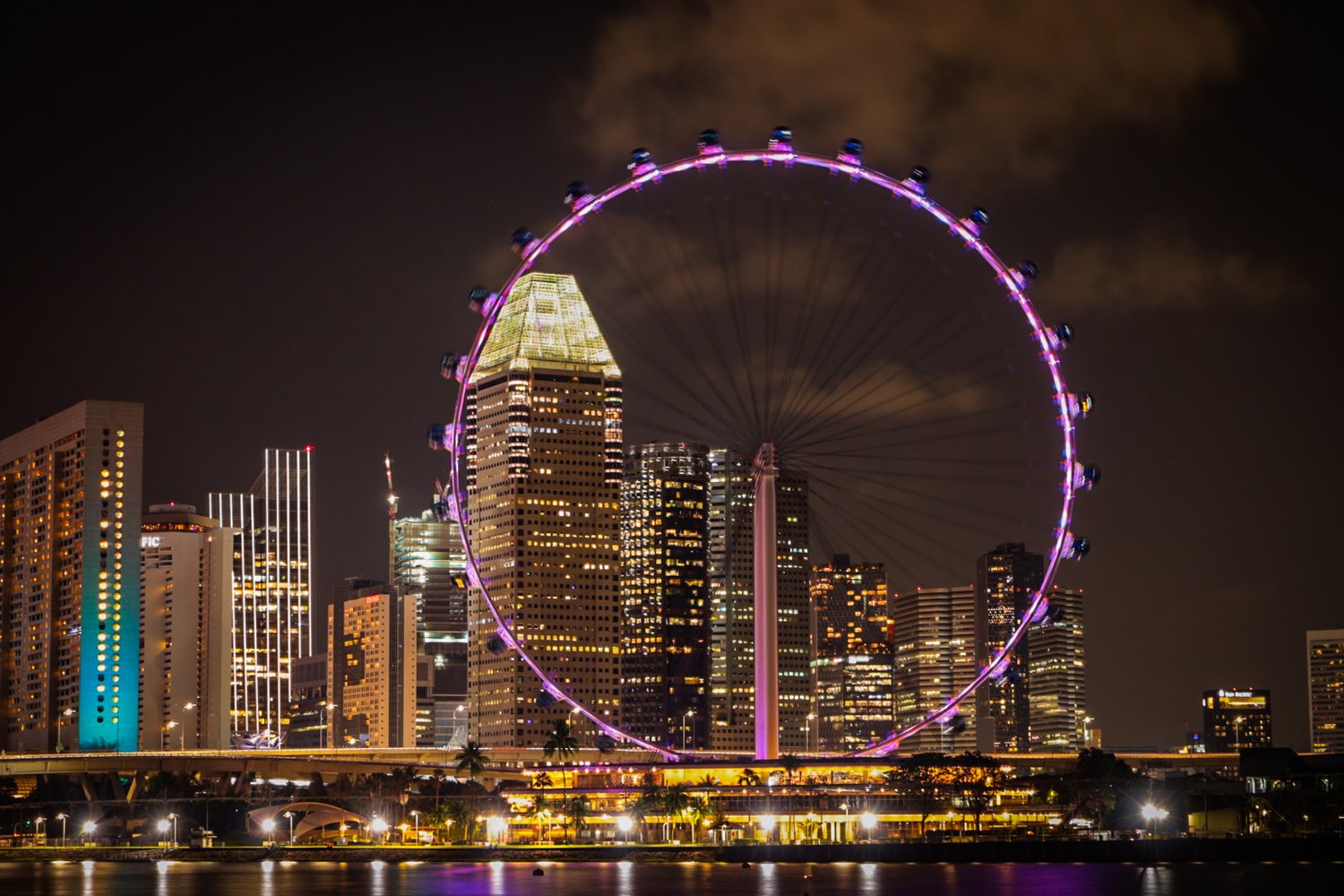 The Singapore Flyer forms a perfect arc of light above the Marina Bay skyline, its slow rotation echoing the steady rhythm of the city below. Skyscrapers glow beneath drifting cloud, reflecting off the water in soft layers of colour.