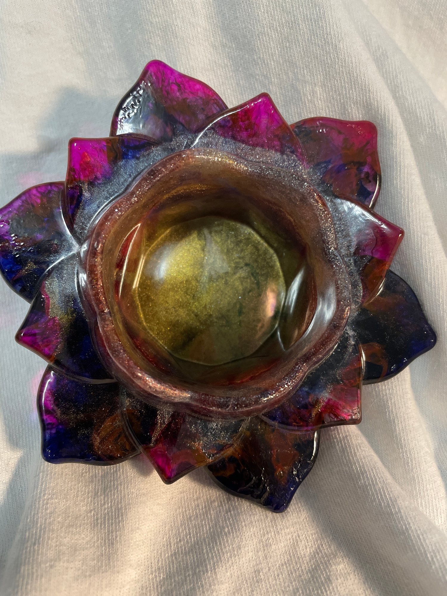 Large tea light holder is 5 inches across from widest point and 2 inches high