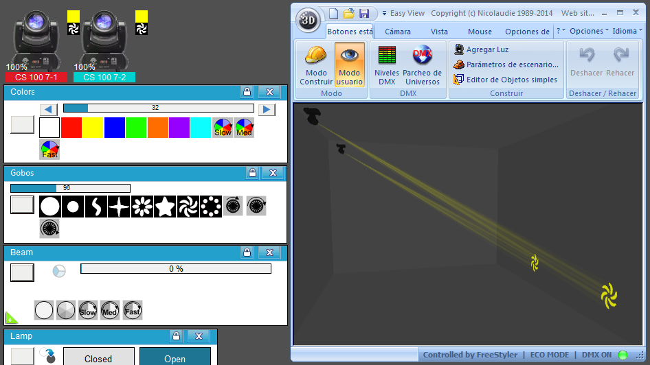 - Esta librería NO reemplaza al Fixture de Freestyler o QLC+, sólo es para ver la representación 3D. Es decir, HAY QUE TENER YA EL FIXTURE DE FREESTYLER o de QLC+ para controlar el equipo real.