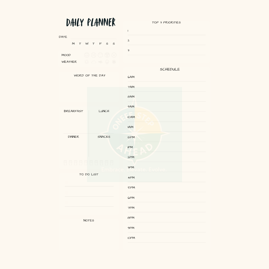 Stay organized and intentional with this simple Daily Planner. Track your top 3 priorities, meals, mood, schedule, water intake, and more—all in one place.