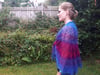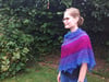 A sumptuous lace and beaded shawl shaped using Elizabeth Zimmermans’s Pi formula. The 2/3 circular shape helps the shawl to sit neatly around the shoulders. The lace pattern is highlighted with beads to catch the light.