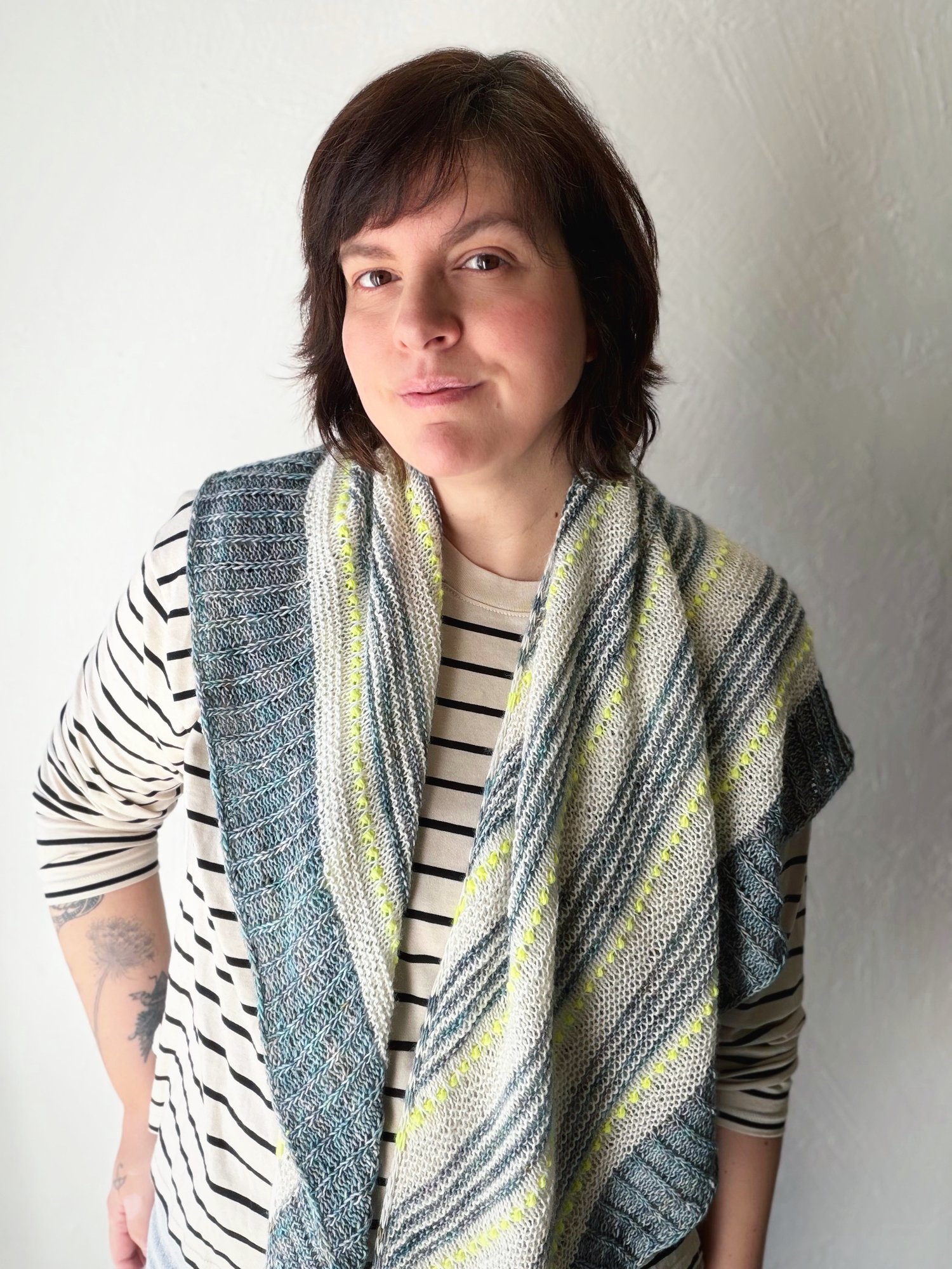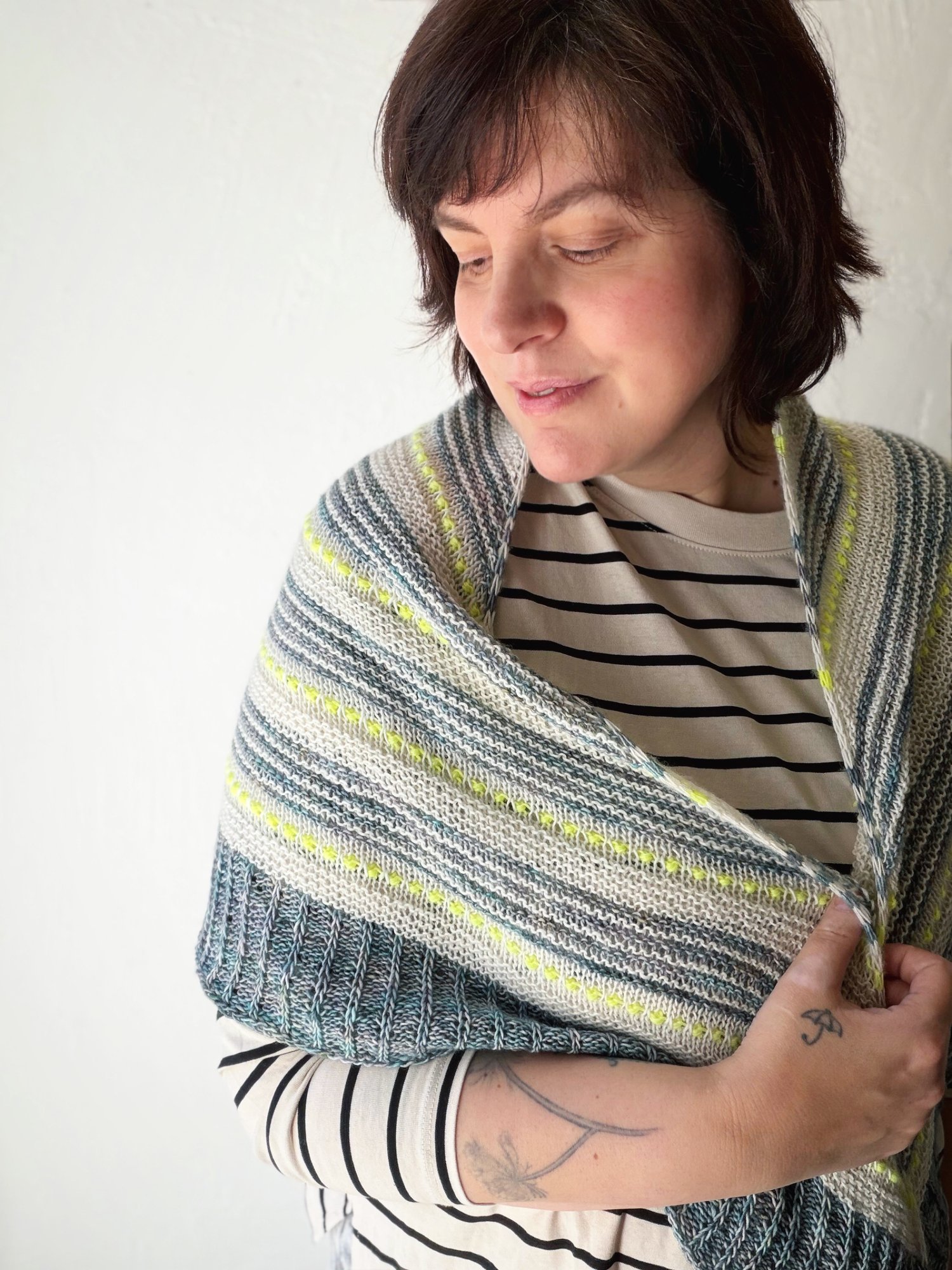 Ce châle a été tricoté durant une semaine de bonheur sous le soleil de l’Italie, et j’espère qu’il porte avec lui toute l’énergie lumineuse dans laquelle il est né.