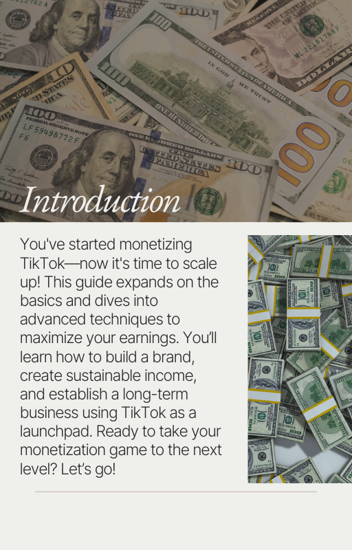 "Take your TikTok earnings to the next level! This guide teaches you how to scale your income, create exclusive content, and build a long-term brand beyond TikTok. Includes actionable exercises to help you start today!"