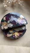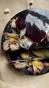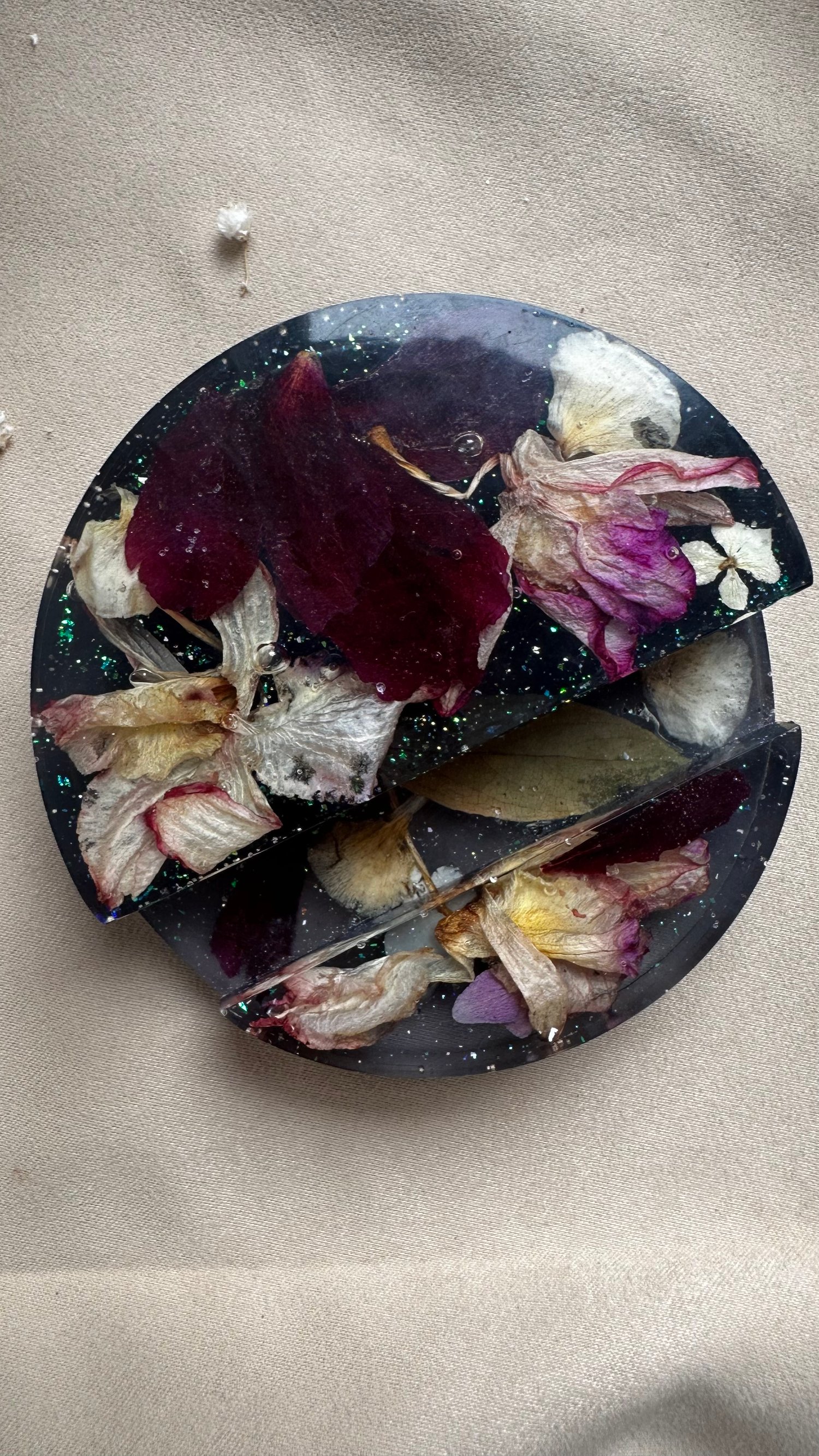 The “Midnight Garden” stand is a handcrafted phone and tablet holder made with real dried flowers, preserved in a deep black resin base with fine sparkling accents. Each petal and leaf is frozen in time, creating a mysterious, moonlit garden feel — elegant, romantic, and one-of-a-kind.