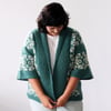 Introducing Storyweaver, a boxy oversized open cardigan with short sleeves, perfect for wrapping yourself in comfort on relaxed days. This design features a charming folkloric stranded knit pattern, adding a touch of whimsy to your wardrobe. Knit side to side with a steeked hem, it’s an interesting and rewarding project. Storyweaver makes a lovely casual house jacket, ideal for curling up on the couch with a book.