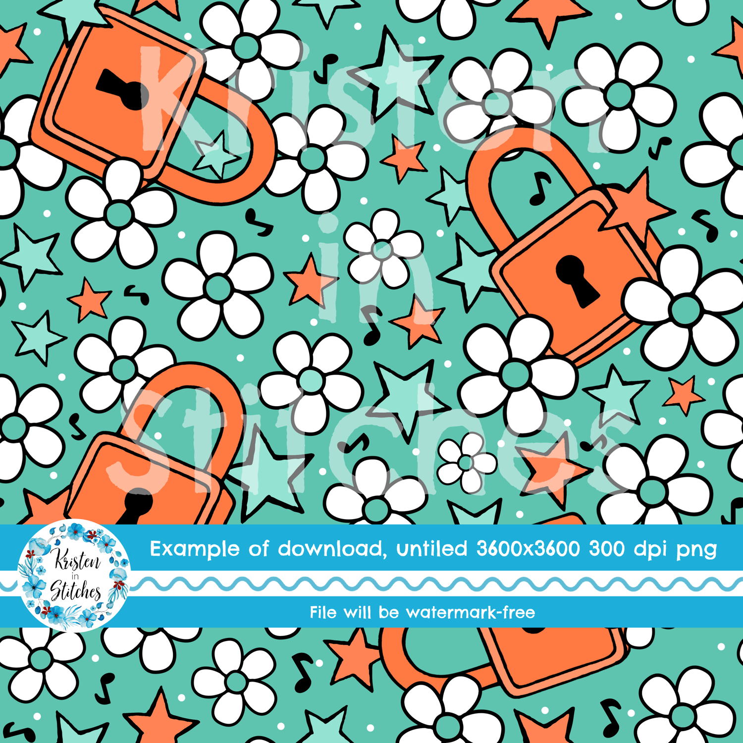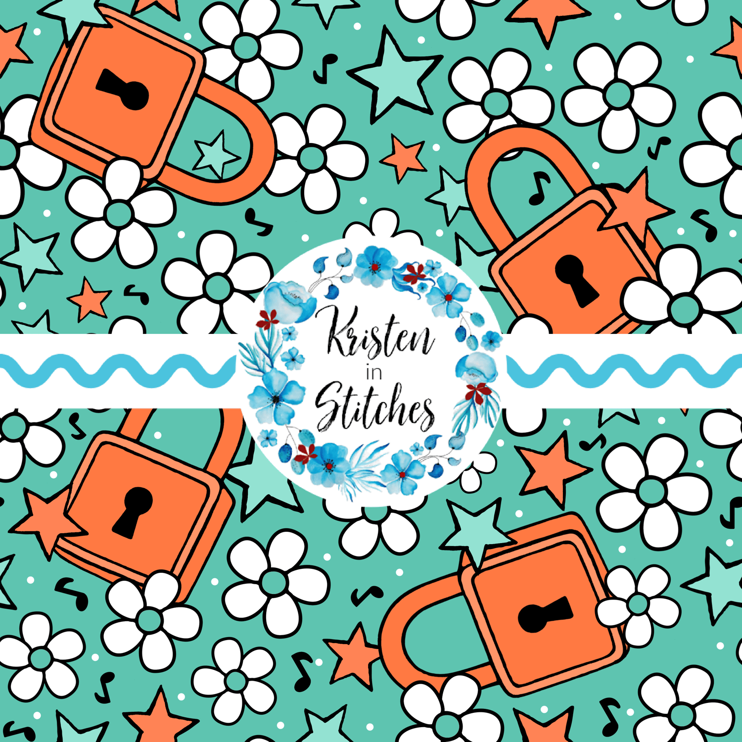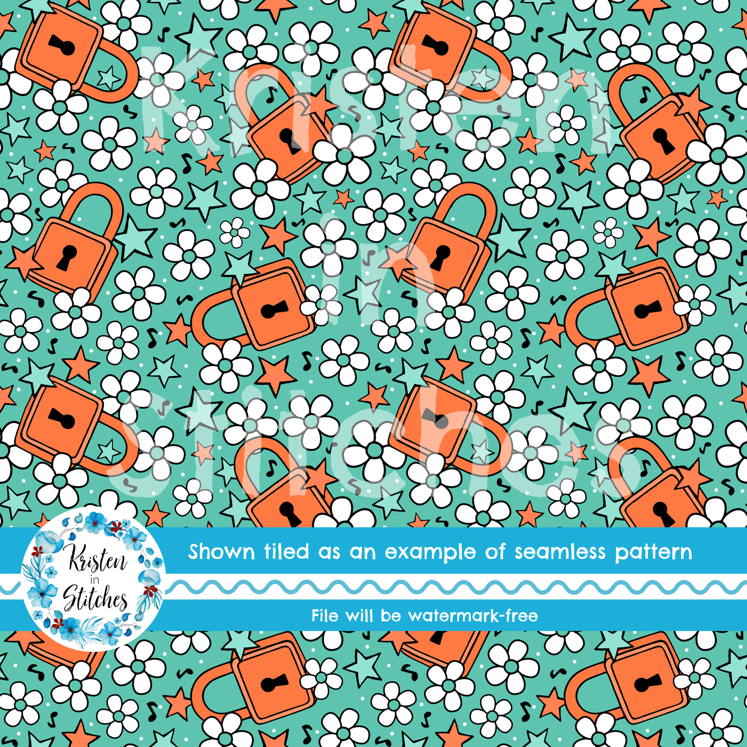 Orange lock icons with sweet daisy flowers, music notes and stars on mint green.