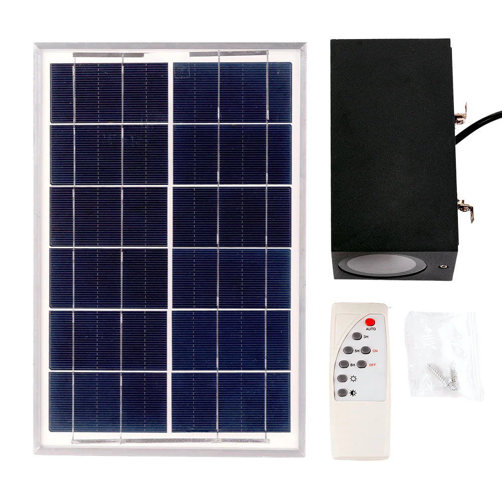 Kit including solar LED wall light with integrated high-power lithium battery, solar panel, remote control, and installation hardware. Incorporates light sensors. Ideal for automatically lighting any outdoor area without the need for electricity.