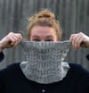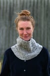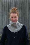 Tyto Alba is worked from the bottom up in the round and features a striking central cabled panel complemented by a slipped stitch pattern to create a warm, bouncy fabric for those chilly days. The difference in the row gauge of the two patterns is used to positive effect, creating a dramatically shaped front section which sits perfectly where your coat closes; at the back there is less bulk, so the cowl sits comfortably against the back collar. Short rows are worked at the top of the cowl back to keep out those chilly winds!