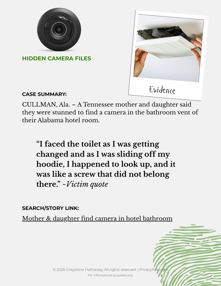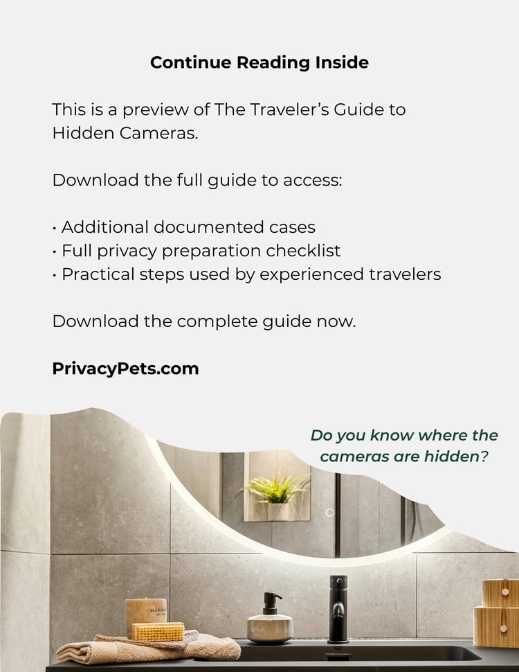 A free educational guide featuring documented hidden camera cases, common hiding locations, and simple privacy preparation habits for modern travelers.