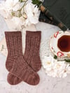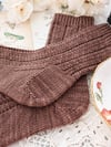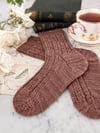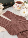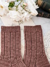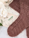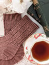 These socks have a simple, repeating stitch pattern that mimics the rhythm of a poem. The stitch pattern is just eight stitches over two lines, but the loops and swoops of the yarn overs and slipped stitches give the entire sock an almost musical quality as you work on it. With a basic heel flap and a classic wedge toe, these cuff-down pretties are perfect for adding some poetry to your sock drawer.