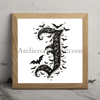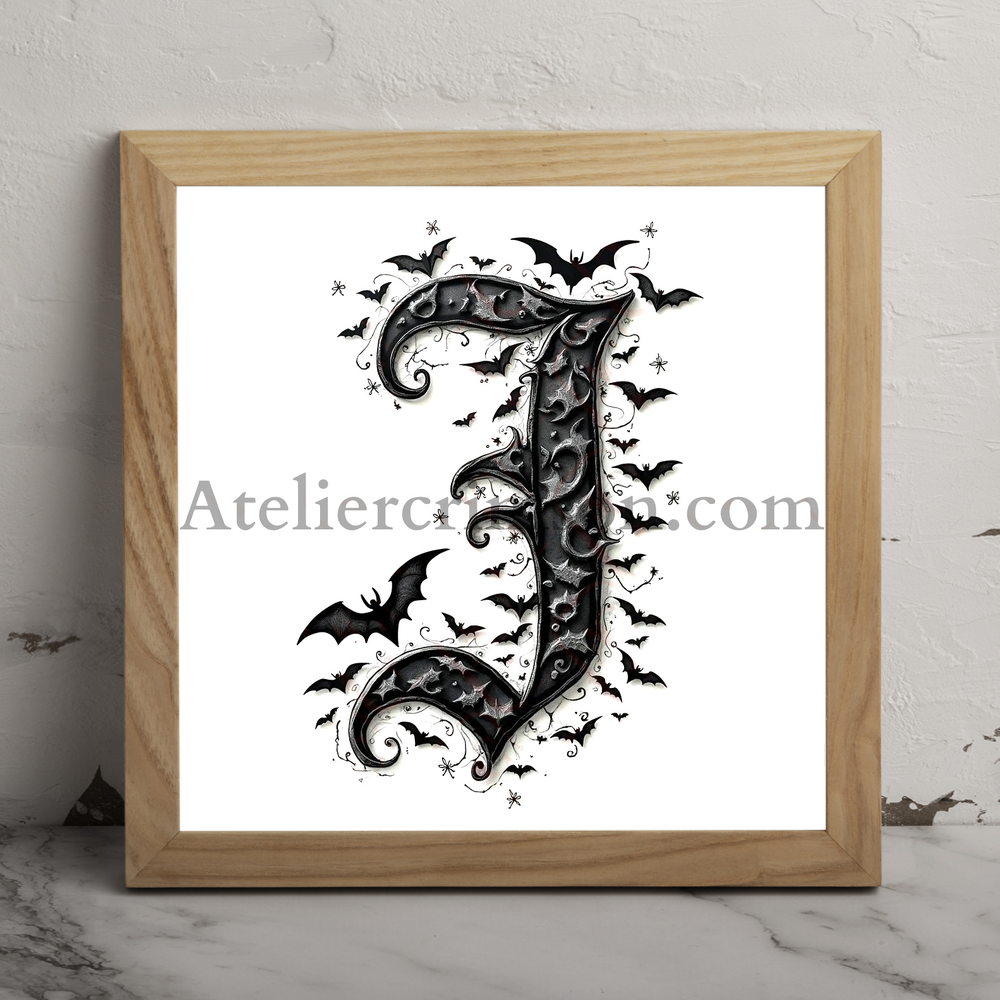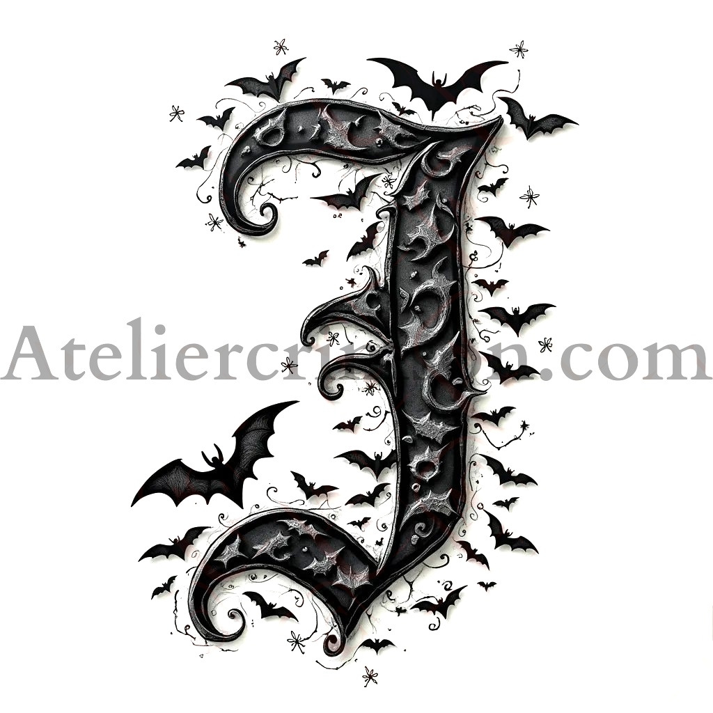 The letter J coloring book halloween occupying 90% of a 1024x1024 image. Use an Old English font style with clear outlines resembling a coloring book page. The character is composed of intricate bat silhouettes, creating a spooky Halloween atmosphere. Use only pure black (#000000) for the character and outlines, and white for the background.2D, black and white style resembling a high-quality adult coloring book page.