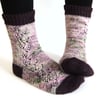 This pattern uses the following techniques: working small circumferences in the round, lace, twisted stitches, German short rows, and whip stitch. Ability to follow charts is recommended but written instructions are also provided for the lace pattern.The pattern assumes knowledge of a cast-on and bind-off method for toe-up socks; references are given for a few alternatives.