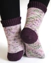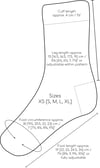 The socks come in five sizes with adjustable foot and leg length. Right and left socks are mirror images of each other and can be worked two-at-a-time. Contrast-colored peasant heels with short-row mini gussets are worked last.