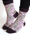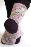 Forgotten Memories is a pair of toe-up socks that's ideal for showcasing two colors of fingering-weight handdyed yarn. A delicate lace vine travels on the outside of the foot and leg. Otherwise the socks are worked in stockinette, letting the yarn do the talking.Toes, cuffs, and peasant heels are worked in a contrasting color. Twisted-rib cuffs end in a picot edging folded to the inside.