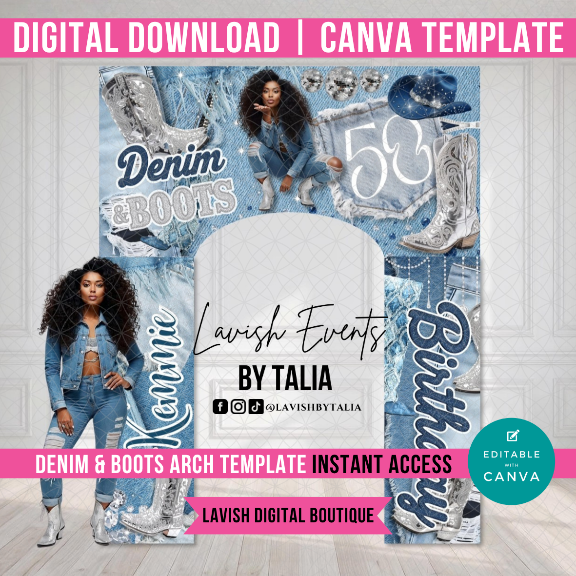This listing is for 1 digital entrance/ arch design template. The design is editable in Canva, so you can change the text, font, colors, and graphics to suit your style. You can even add your own images or logo to make it truly unique. The file is layered for easy editing, but Canva experience is necessary. The denim and diamond background can't be changed.