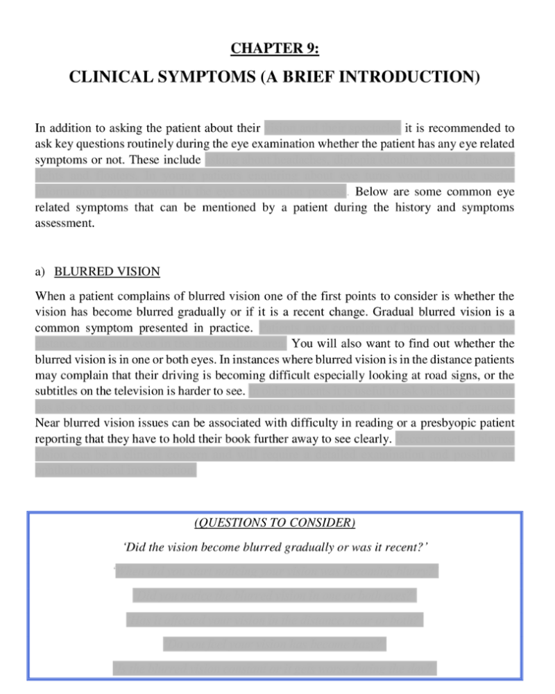 This ophthalmic history assessment study guide is designed to give you an understanding and reasoning behind the importance of taking a history and symptoms assessment during an eye examination. This 27 page study guide will concentrate more on the process of the history assessment. Key sections of the history assessment will be covered in various chapters including points to consider when examining a young child and also covering some common clinical symptoms which can be presented by a patient. I have also included possible questions to consider when taking a history and symptoms assessment. I hope by using this ophthalmic history assessment study guide it gives you a broader understanding and knowledge behind taking a good history and symptoms assessment.