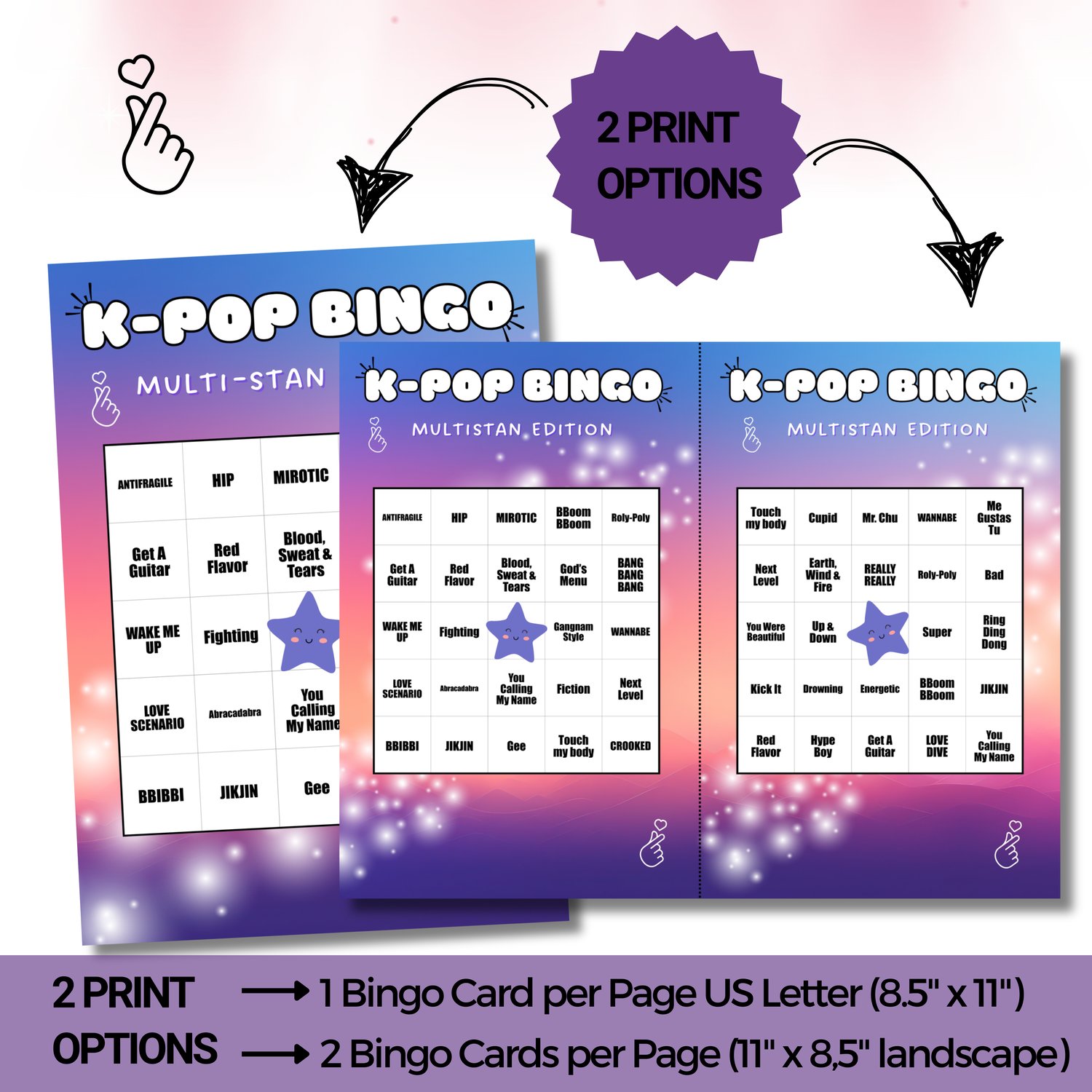 Instantly download 50 unique bingo cards featuring songs from the hottest groups & soloists—perfect for Cupsleeve events, K-Pop game nights, birthday parties, slumber parties and more.