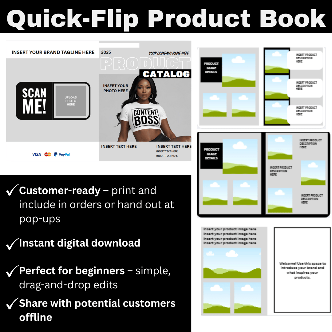 Whether you sell digital downloads, handmade goods, beauty products, jewelry, apparel, or services, this editable booklet helps you market smarter. No tech skills required. No fancy software. Just your products, your style, your hustle.