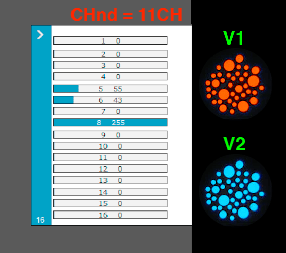 * Verifique que coincidan estos canales: 8 Dimmer, 6 en el valor 43 = Gobo de la cuarta foto, 5 en el valor 55 = Naranja (V1) o Celeste (V2).