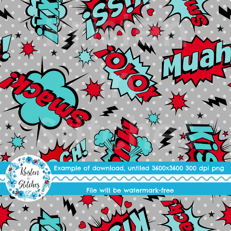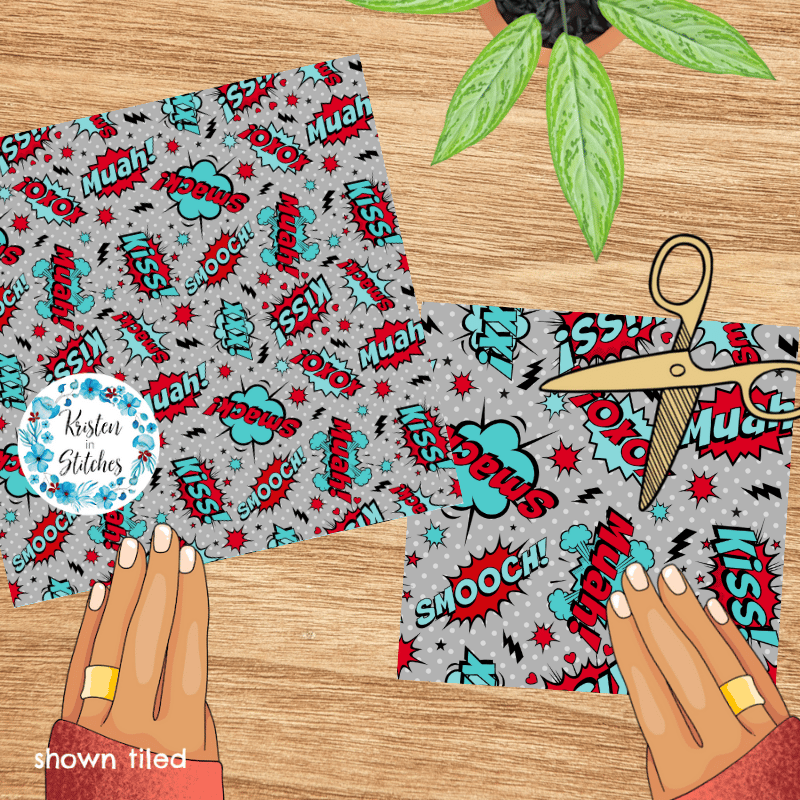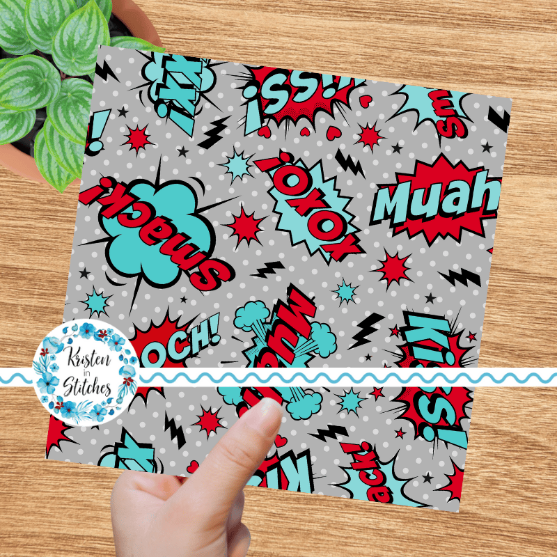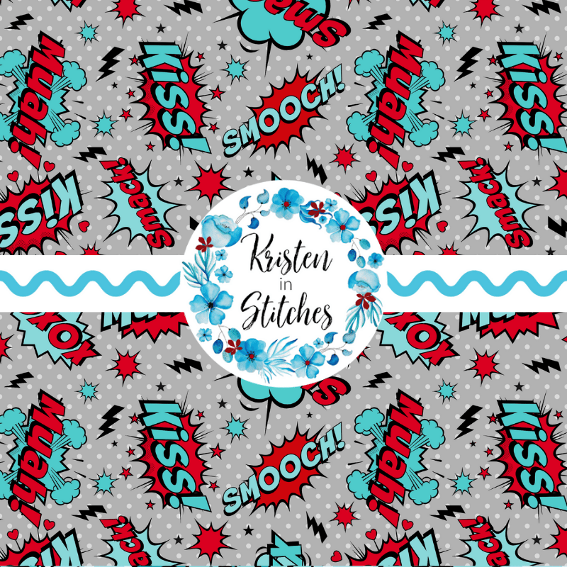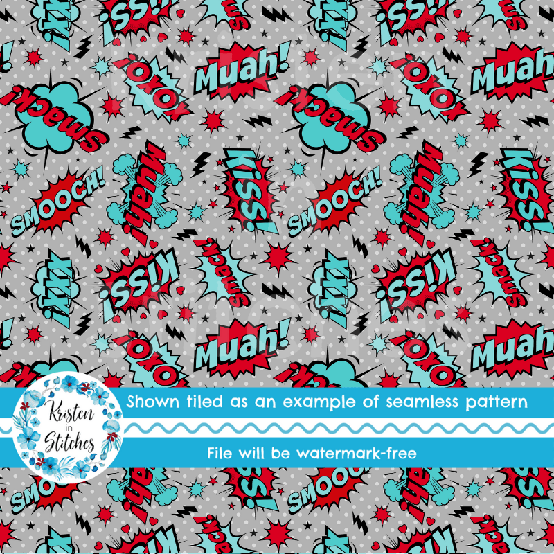 Valentine Kiss Comic Bubbles Seamless Pattern, Red Blue and Grey