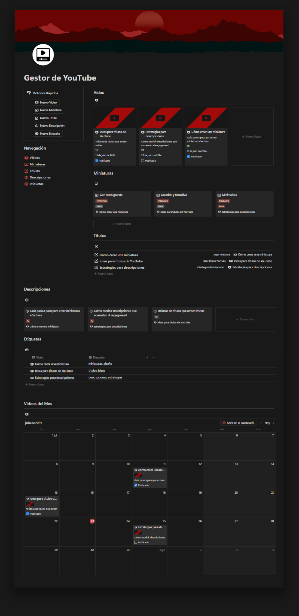 ¿Eres creador de contenido en YouTube y buscas una manera de organizar y optimizar tu canal? Nuestra plantilla de Notion para la gestión de YouTube es la herramienta definitiva para mejorar tu productividad y mantener cada aspecto de tu canal bajo control. Diseñada para facilitar el flujo de trabajo y maximizar tu eficiencia, esta plantilla incluye todo lo necesario para gestionar tus videos desde la idea hasta la publicación.