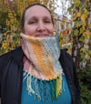 This cowl is provisionally cast on and worked flat, horizontally in stripes, until all stripes have been worked. After joining the last row to the provisionally cast-on row, the cowl is folded in half and the 2 layers of fabric are secured to each other via either fringe or a round of single crochet.