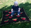 This lacy square handkerchief scattered with strawberries was inspired by Desdemona’s handkerchief. Although Othello describes the handkerchief as being made from silk, I chose to use a light cotton and linen blend because that seemed more like handkerchief material to me. It can be worked in plain white and left plain or dyed, or it can be worked in intarsia. To demonstrate that this project could be decorative and useful, I also made a blanket with worsted-weight yarn.
