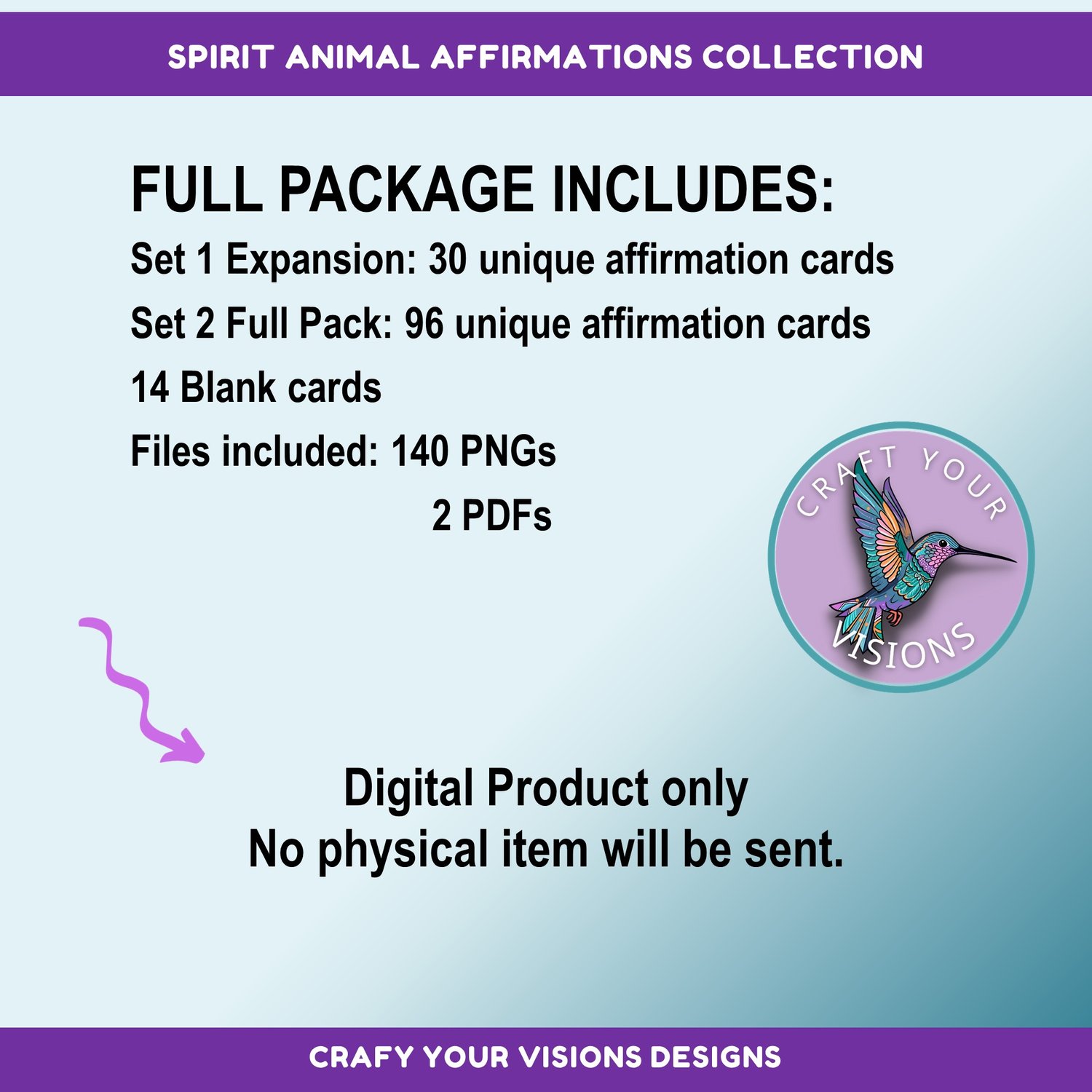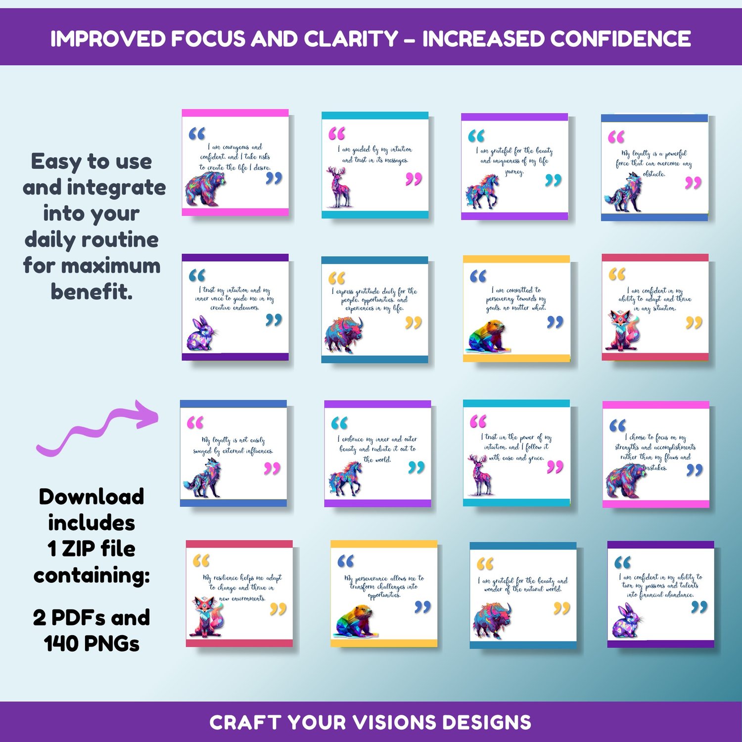The Spirit Animal Affirmations Collection comes in two convenient zip files, containing 140 high-quality