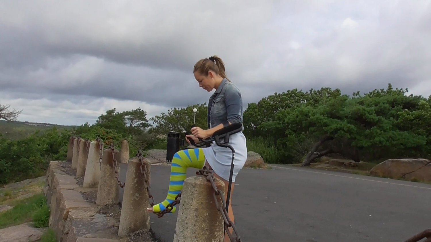 Melinda wants to show off how great she had become with her crutches today since she broke her right leg two months ago, she crutches down the road with special types of crutches as she small talks with the cameraman when suddenly, she decided that she was going to crutch off road take a shortcut instead. She climbs up on rocks and starts to hike into the overgrown forest where there’s no path but just grass, trees and stones. In the mean time there’s a very good closeup of her blue and yellow LLC as we follow her very closely. Melinda makes it to the other side and ends up popping out at a parking lot space. She continues happily to follow the big road, crutching to the edge of the cliff and enjoys the astonishing view over entire city of Gothenburg. Melinda puts her casted leg up to rest on top of the chain as she stands there for a while, before it’s time to head back Melinda takes one last break while sitting on a rock, showing off her casted leg one last time in an amazing closeup from every possible angles.