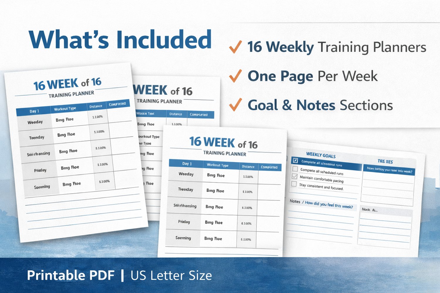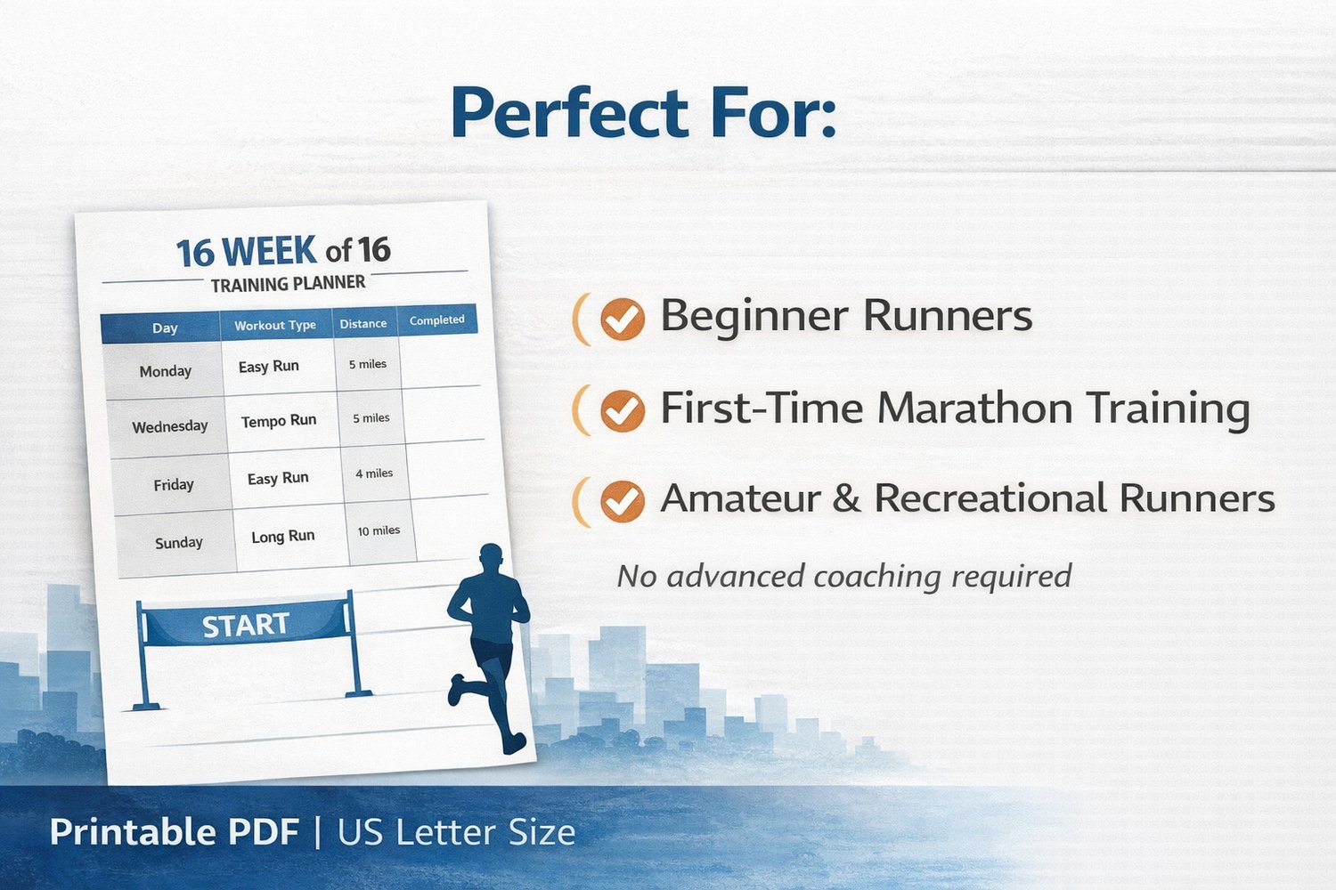 This 16-Week Marathon Training Planner is a printable PDF running program designed for beginner and amateur runners who want a clear, structured, and easy-to-follow plan to prepare for a full marathon (26.2 miles).