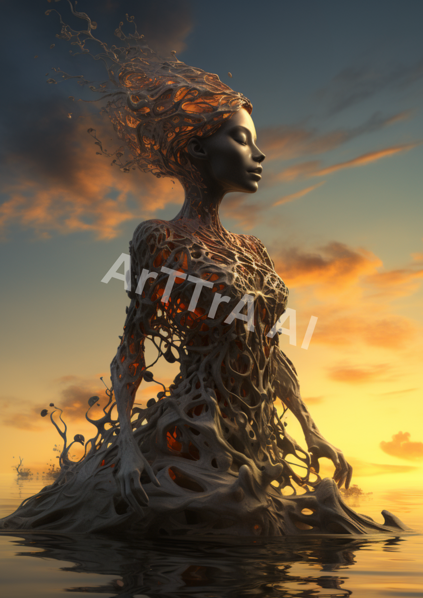 AI artwork that brings together the beauty of the dynamic forces of water and fire in a mesmerizing statue, melding the fluid grace of water with the fierce energy of fire within.