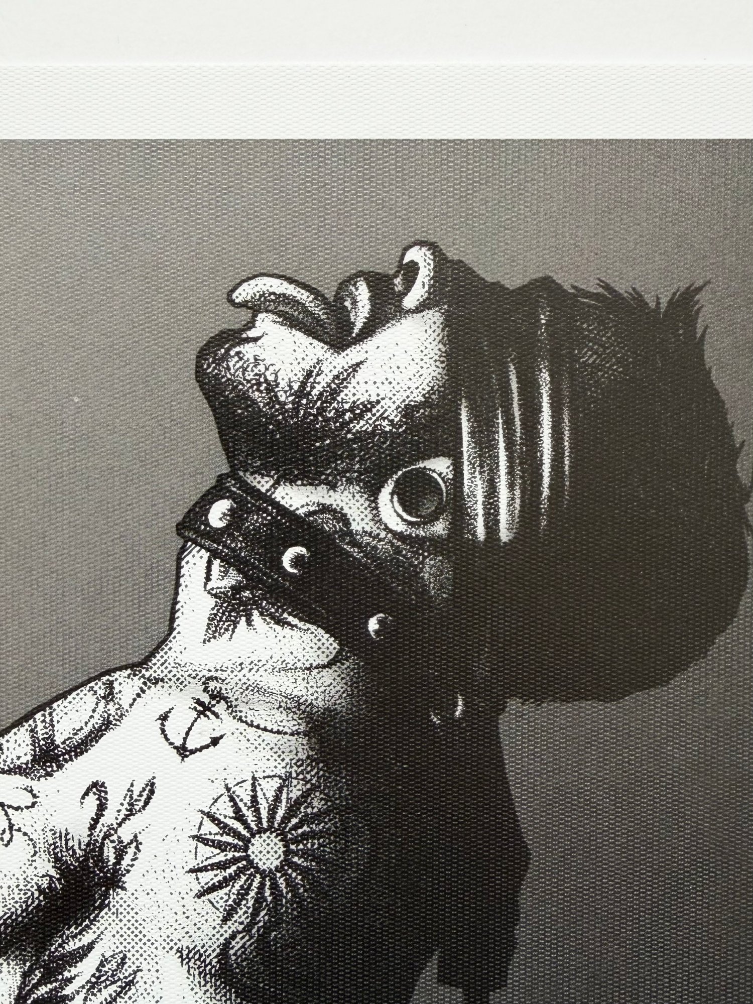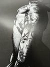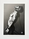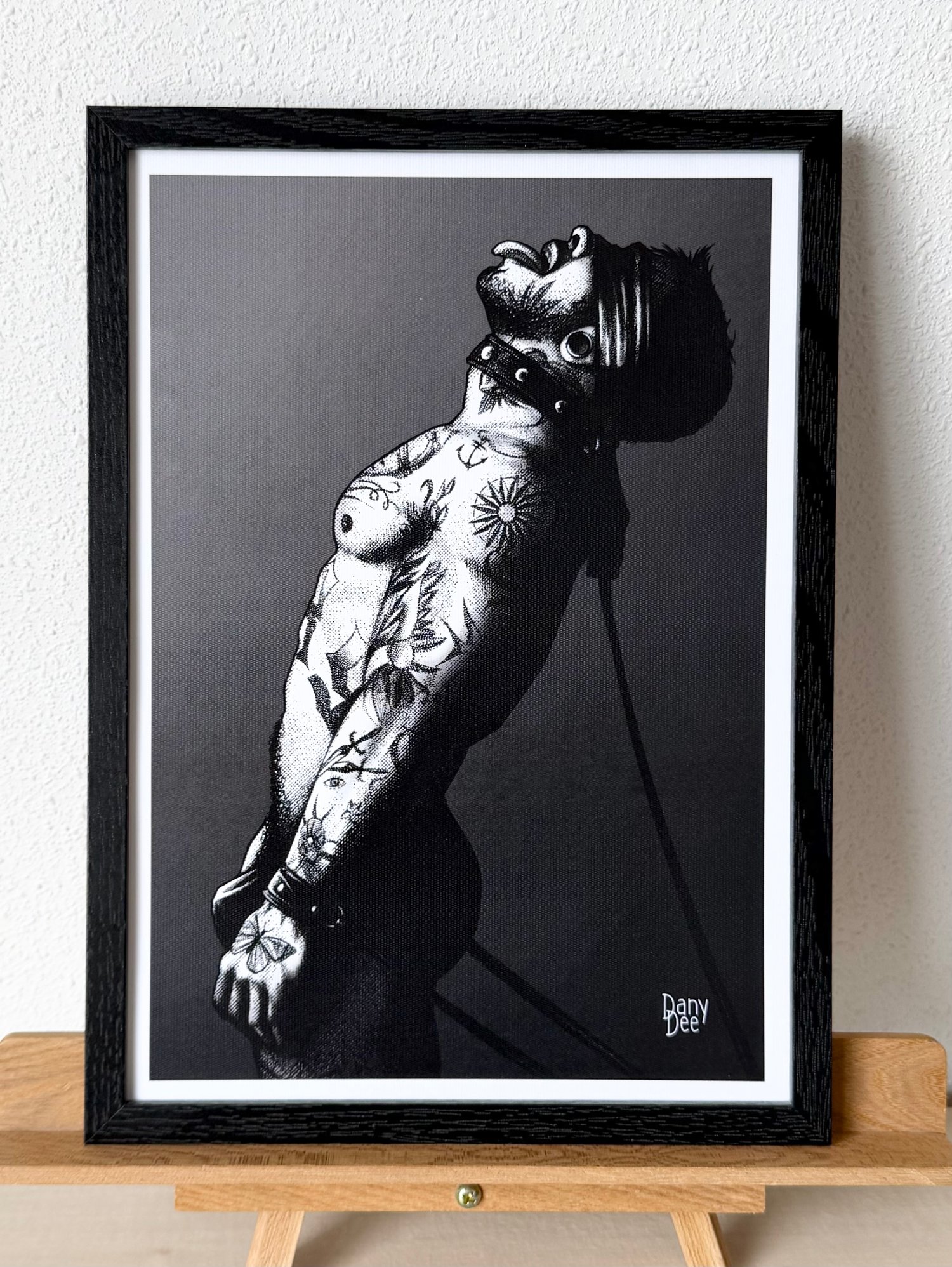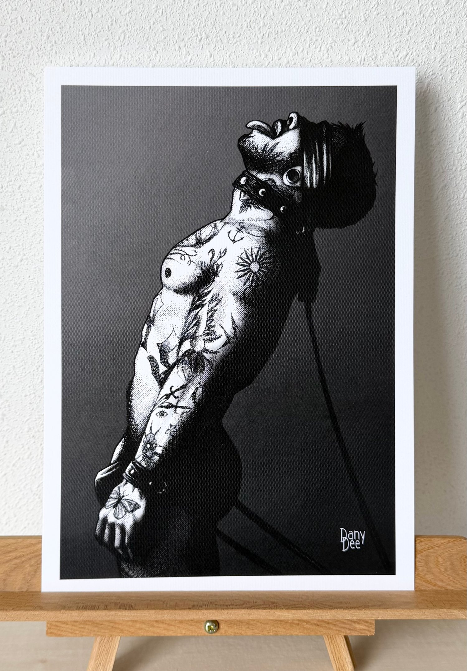 "The Control" is a hand-drawn, monochromatic A4 art print celebrating BDSM culture — a bold homoerotic illustration of a heavily tattooed man in a leather blindfold and collar leash, chin raised in complete surrender, perfect for gay BDSM art collectors or queer home decor.