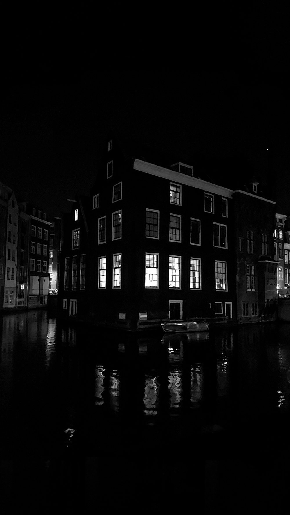 The Black House captures the haunting beauty of Amsterdam’s night reflections. This black-and-white photograph portrays the city’s iconic dark canal house illuminated by warm window lights, mirrored gently on the quiet water below. A timeless glimpse into Amsterdam’s mysterious charm, perfect for minimalist or modern interiors.