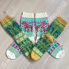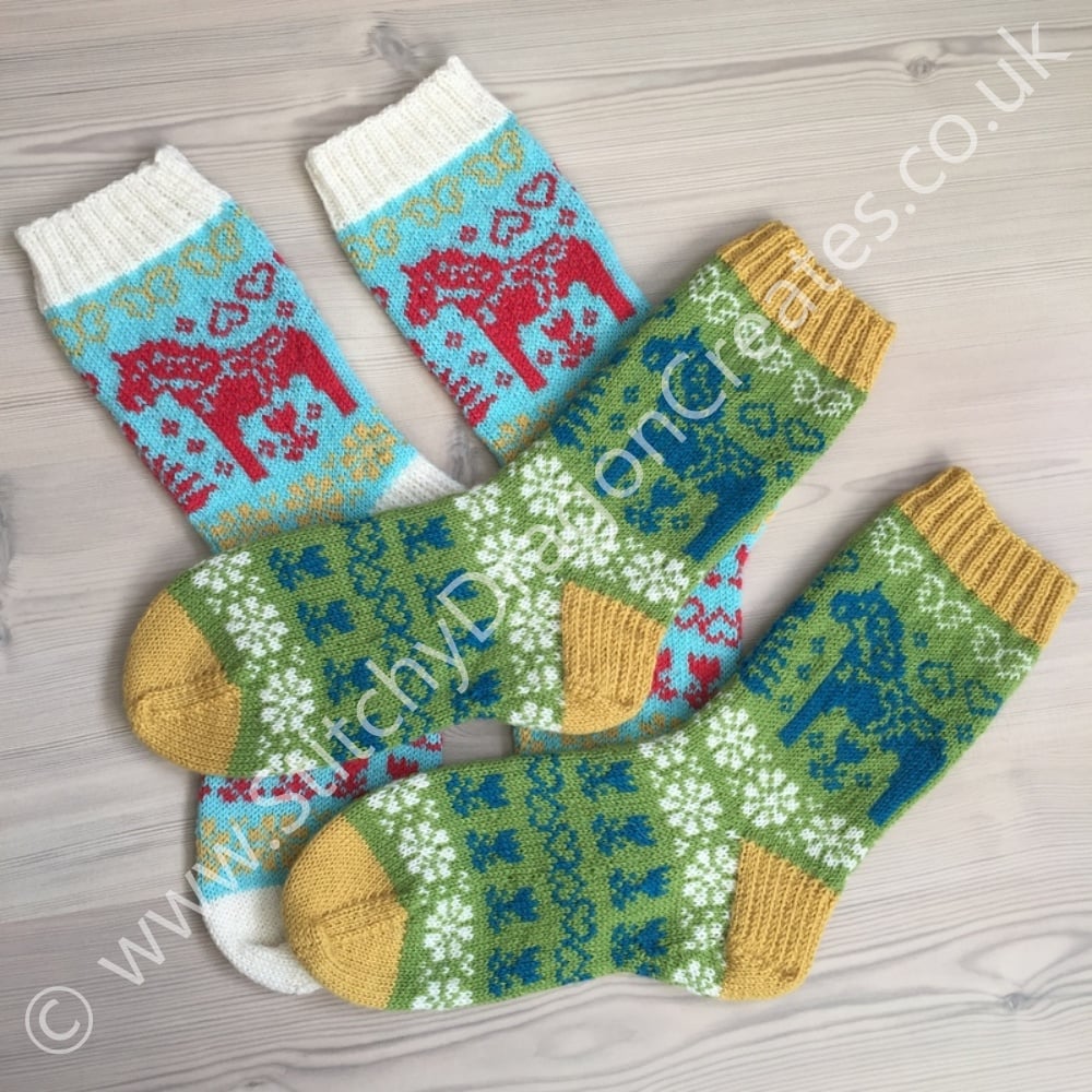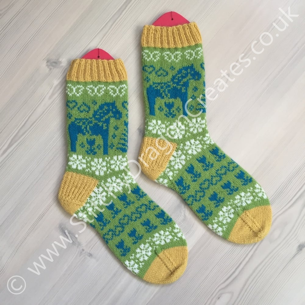 The Dala horse (or Dalahäst in Swedish) is a traditional carved and painted wooden horse that has become a symbol of Sweden and of Swedish handcrafts. The man credited with introducing the painting technique still used today also emigrated to the American Midwest around the same time as my Scandinavian ancestor. I designed these socks during the first Covid lockdown with the hope that knitting them would remind people of the wide world that was still out there for us to explore in the future.